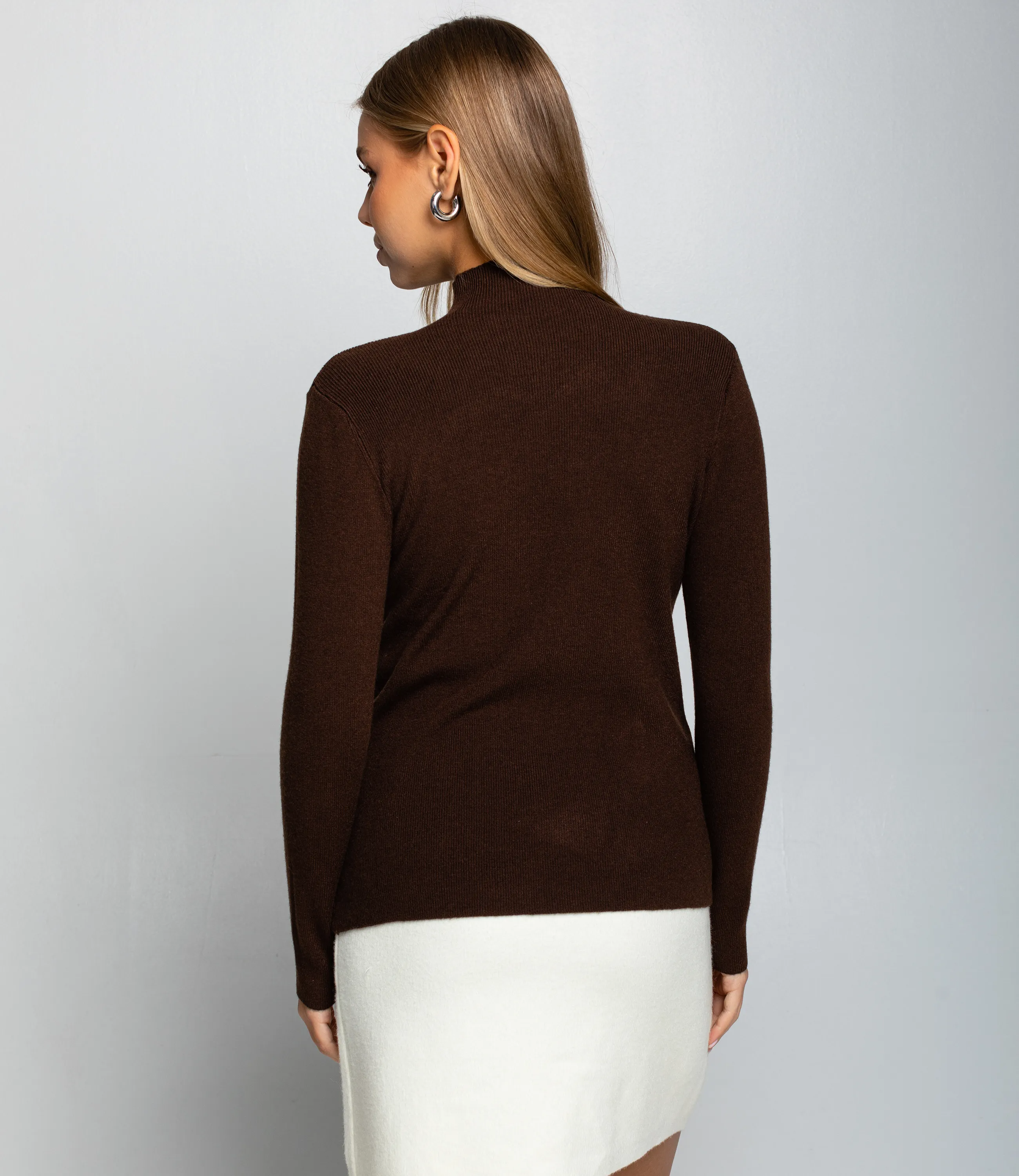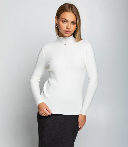 Водолазка — это часть гардероба, которая подчёркивает женственность и утончённость каждой покупательницы. Модель выполнена из гладкого трикотажного материала с тонкой и плотной фактурой; облегающий силуэт, классический высокий воротник и длинные приталенные рукава создают лаконичный и универсальный образ. По центру передней части проходит едва заметный вертикальный шов, добавляющий композиционной строгости и изящества, а небольшая металлическая подвеска‑улыбка со стразами придаёт изделию аккуратную стильную деталь. Водолазка отлично вписывается в базовый гардероб и легко комбинируется с брюками и юбками, а также служит идеальным слоем в многослойных образах. Для пошива использована ткань 65% хлопок, 30% полиэстер, 5% эластан: хлопок обеспечивает комфорт и хорошую воздухопроницаемость, полиэстер повышает прочность и стойкость цвета, эластан гарантирует посадку и сохранение формы после носки и стирок. Материал устойчив к частым стиркам, не деформируется и долго сохраняет презентабельный вид, что снижает количество возвратов и рекламаций. Для оптовых покупателей водолазка является выгодной и оборотистой позицией: базовый дизайн упрощает формирование размерного ряда и уменьшает риск непроданных остатков, а универсальность модели повышает её привлекательность для широкой аудитории. Рост 168, 89-63-90.
