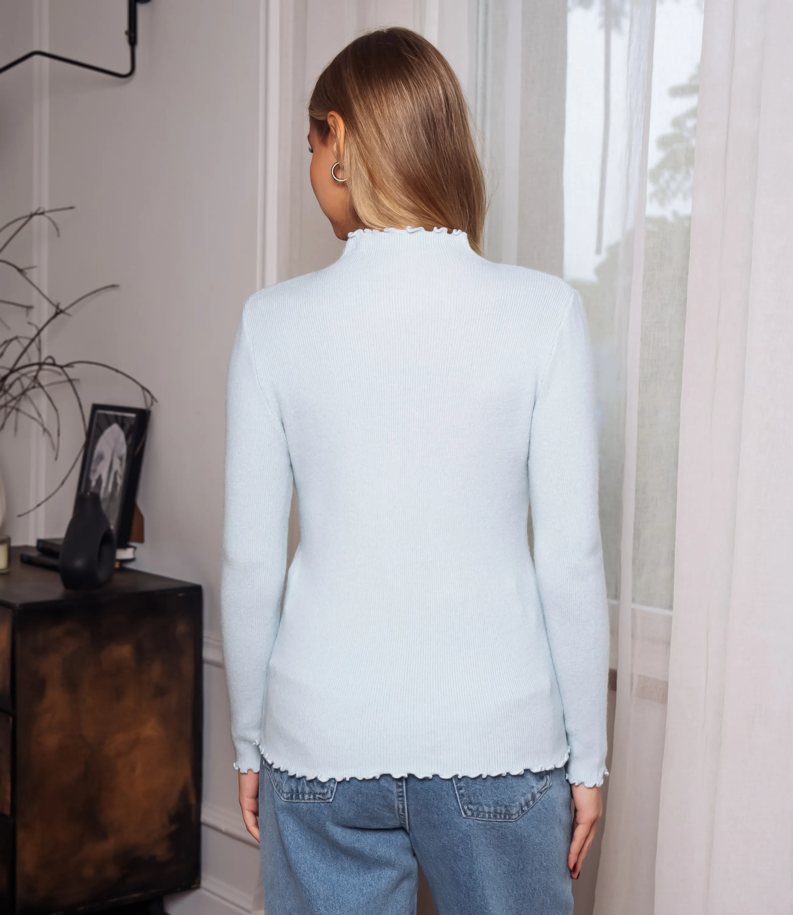Водолазка — это часть гардероба, которая подчёркивает женственность и утонченность каждой покупательницы. Водолазка представляет собой облегающий свитер с высоким воротником-стойкой, доходящим до середины шеи и слегка прилегающим к ней; воротник имеет декоративный волнистый (рюшевидный) край. Ткань тонкая, мягкая и эластичная, плотно облегает торс и рукава, подчёркивая силуэт, без излишних складок. Рукава длинные, узкие, повторяют линию руки до запястья, где также оформлен небольшой воланчатый край, совпадающий по фактуре с воротником. Низ изделия прилегающий с такой же мелкой волнистой отделкой, что создаёт единый декоративный акцент по краям. Для пошива использована ткань 50% акрил, 45% хлопок, 5% шерсть. Такое сочетание обеспечивает комфорт и хорошую воздухопроницаемость хлопка, прочность и стойкость цвета за счёт полиэстера и эластичность посадки благодаря эластану. Материал сохраняет форму и презентабельный вид после многократных стирок, что уменьшает долю возвратов и рекламаций при розничной продаже. Для оптовых покупателей водолазка представляет собой выгодную и оборотистую позицию: базовый дизайн упрощает комплектование размерного ряда и снижает риск нереализованных остатков, а универсальность модели расширяет целевую аудиторию. Рекомендуем включать водолазки в базовые капсулы, формировать наборы ключевых оттенков и готовые комплекты «верх + низ» для повышения среднего чека и ускорения оборачиваемости. Рост 168, 89-63-90.