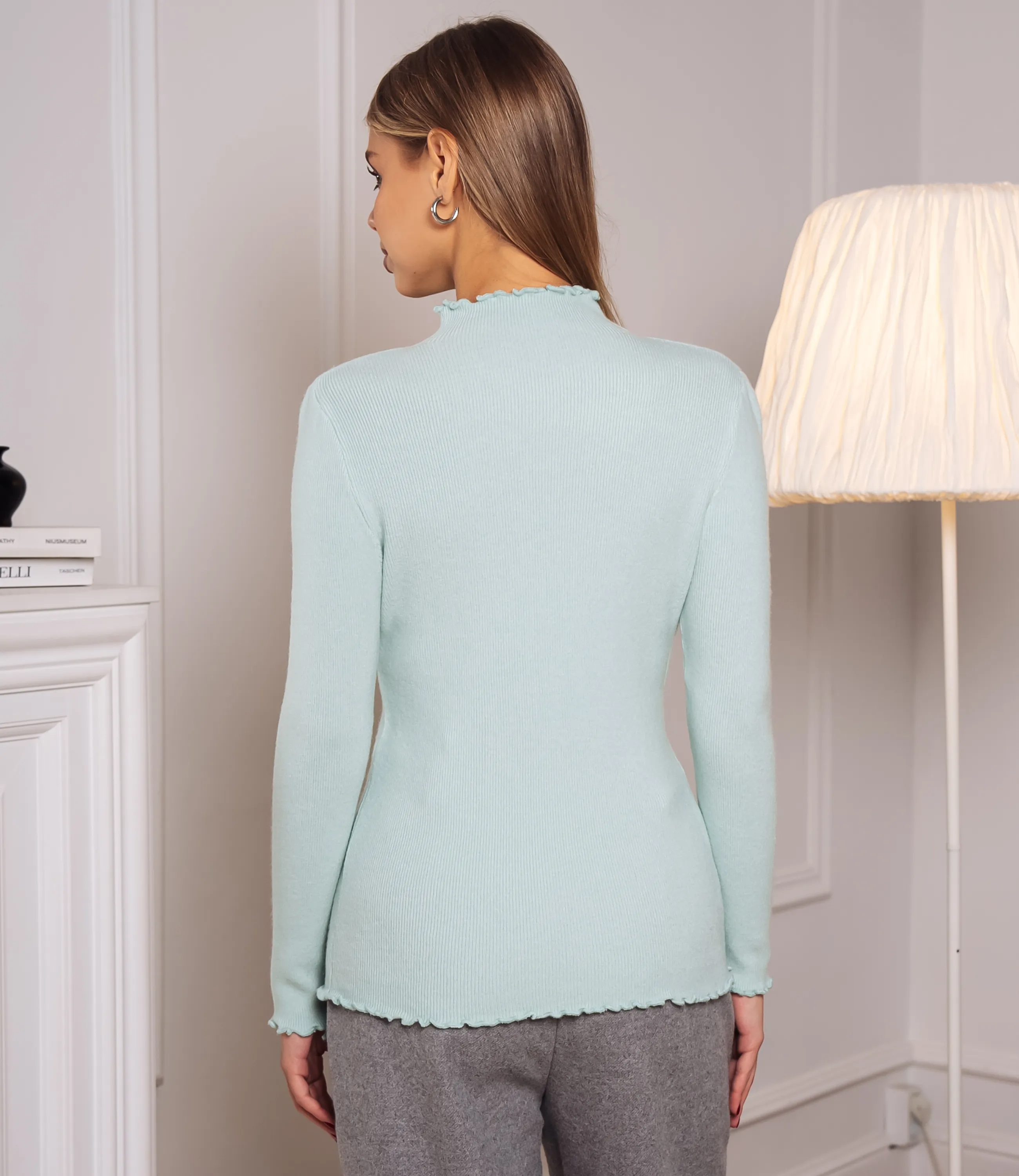 Водолазка — это часть гардероба, которая подчёркивает женственность и утонченность каждой покупательницы. Водолазка представляет собой облегающий свитер с высоким воротником-стойкой, доходящим до середины шеи и слегка прилегающим к ней; воротник имеет декоративный волнистый (рюшевидный) край. Ткань тонкая, мягкая и эластичная, плотно облегает торс и рукава, подчёркивая силуэт, без излишних складок. Рукава длинные, узкие, повторяют линию руки до запястья, где также оформлен небольшой воланчатый край, совпадающий по фактуре с воротником. Низ изделия прилегающий с такой же мелкой волнистой отделкой, что создаёт единый декоративный акцент по краям. Для пошива использована ткань 50% акрил, 45% хлопок, 5% шерсть. Такое сочетание обеспечивает комфорт и хорошую воздухопроницаемость хлопка, прочность и стойкость цвета за счёт полиэстера и эластичность посадки благодаря эластану. Материал сохраняет форму и презентабельный вид после многократных стирок, что уменьшает долю возвратов и рекламаций при розничной продаже. Для оптовых покупателей водолазка представляет собой выгодную и оборотистую позицию: базовый дизайн упрощает комплектование размерного ряда и снижает риск нереализованных остатков, а универсальность модели расширяет целевую аудиторию. Рекомендуем включать водолазки в базовые капсулы, формировать наборы ключевых оттенков и готовые комплекты «верх + низ» для повышения среднего чека и ускорения оборачиваемости. Рост 168, 89-63-90.