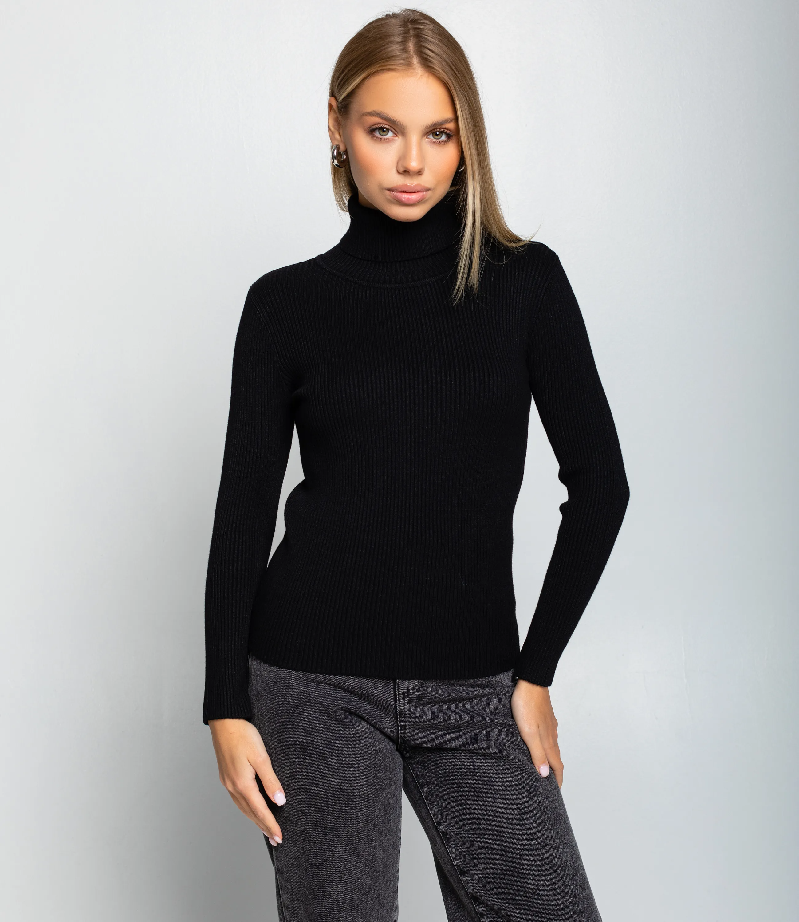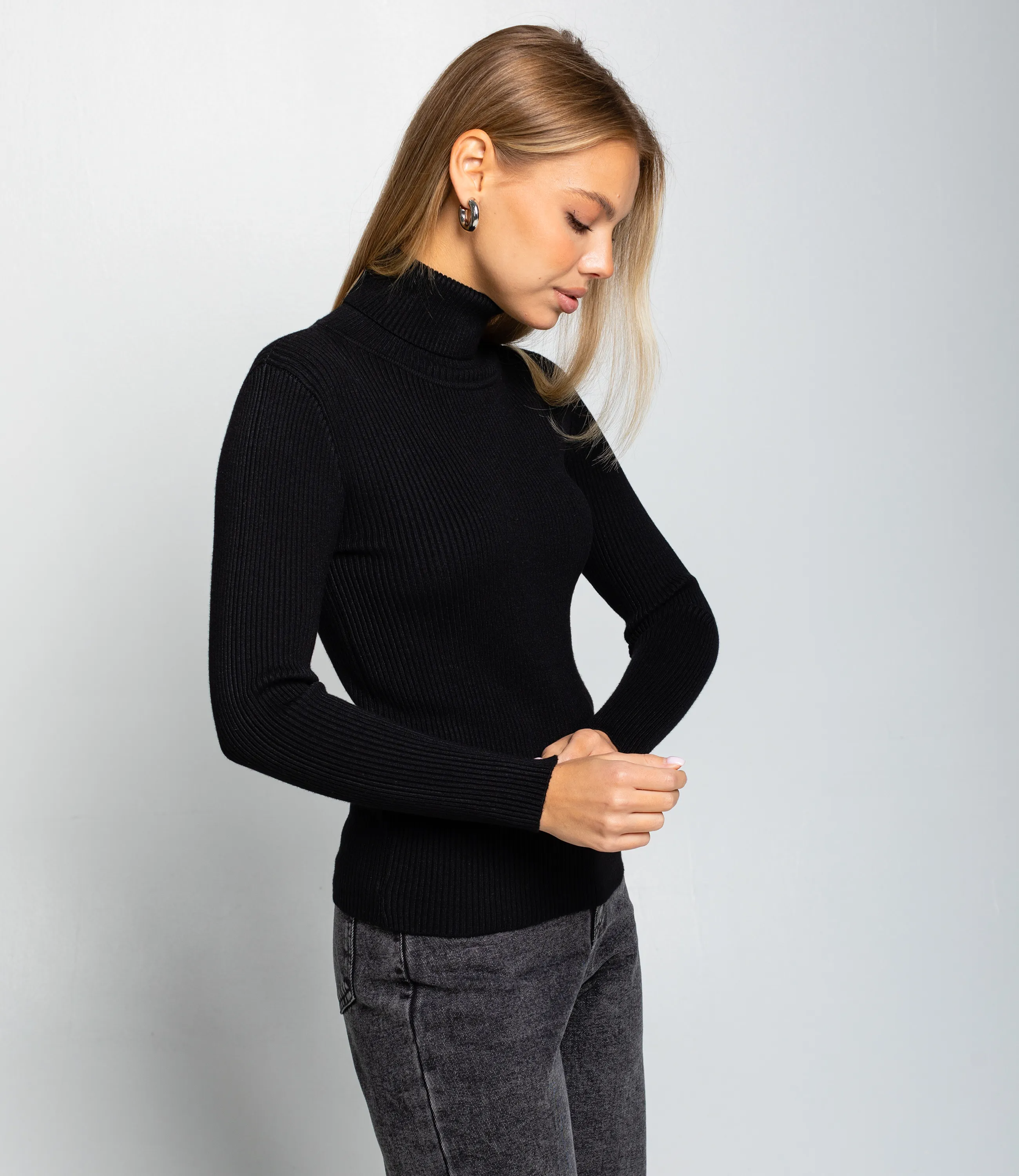 Водолазка — это часть гардероба, которая подчёркивает женственность и утонченность каждой покупательницы. Модель выполнена из тонкого трикотажного полотна с выраженной рубчатой структурой; высокий воротник плотно обхватывает шею, узкий слегка приталенный силуэт и длинные облегающие рукава создают элегантный и лаконичный образ. Край изделия ровный, без лишних декоров и вытачек, что делает водолазку универсальной для повседневных и более строгих комплектов, легко сочетаемой с брюками и юбками. Для пошива использована ткань 65% хлопок, 30% полиэстер, 5% эластан. Такое сочетание обеспечивает комфорт и хорошую воздухопроницаемость хлопка, прочность и стойкость цвета за счёт полиэстера и эластичность посадки благодаря эластану. Материал сохраняет форму и презентабельный вид после многократных стирок, что уменьшает долю возвратов и рекламаций при розничной продаже. Для оптовых покупателей водолазка представляет собой выгодную и оборотистую позицию: базовый дизайн упрощает комплектование размерного ряда и снижает риск нереализованных остатков, а универсальность модели расширяет целевую аудиторию. Рекомендуем включать водолазки в базовые капсулы, формировать наборы ключевых оттенков и готовые комплекты «верх + низ» для повышения среднего чека и ускорения оборачиваемости. Рост 168, 89-63-90.