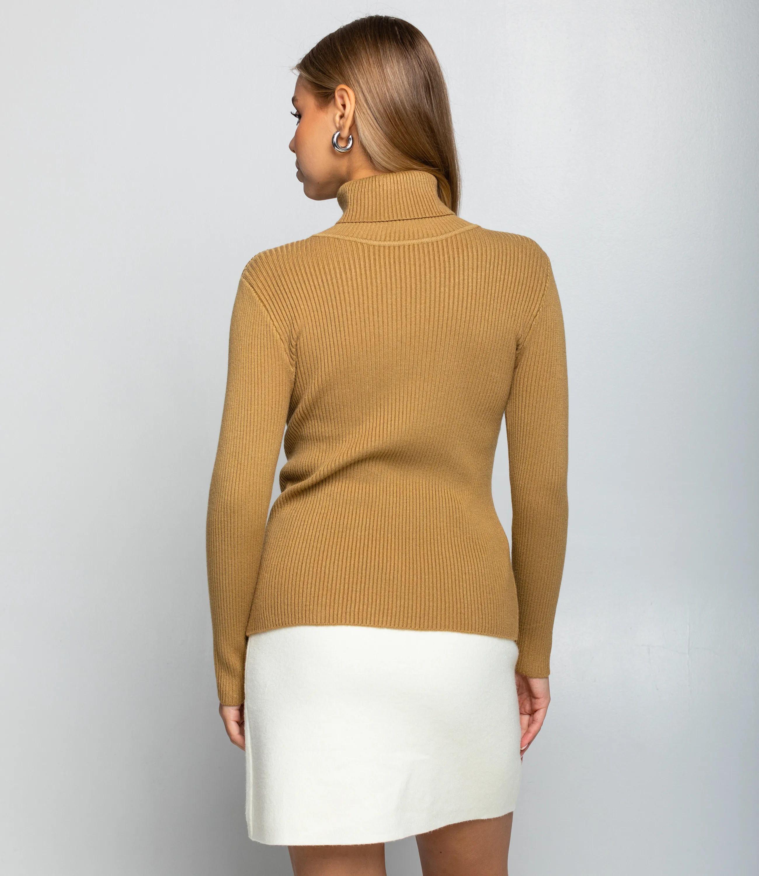 Водолазка — это часть гардероба, которая подчёркивает женственность и утонченность каждой покупательницы. Модель выполнена из тонкого трикотажного полотна с выраженной рубчатой структурой; высокий воротник плотно обхватывает шею, узкий слегка приталенный силуэт и длинные облегающие рукава создают элегантный и лаконичный образ. Край изделия ровный, без лишних декоров и вытачек, что делает водолазку универсальной для повседневных и более строгих комплектов, легко сочетаемой с брюками и юбками. Для пошива использована ткань 65% хлопок, 30% полиэстер, 5% эластан. Такое сочетание обеспечивает комфорт и хорошую воздухопроницаемость хлопка, прочность и стойкость цвета за счёт полиэстера и эластичность посадки благодаря эластану. Материал сохраняет форму и презентабельный вид после многократных стирок, что уменьшает долю возвратов и рекламаций при розничной продаже. Для оптовых покупателей водолазка представляет собой выгодную и оборотистую позицию: базовый дизайн упрощает комплектование размерного ряда и снижает риск нереализованных остатков, а универсальность модели расширяет целевую аудиторию. Рекомендуем включать водолазки в базовые капсулы, формировать наборы ключевых оттенков и готовые комплекты «верх + низ» для повышения среднего чека и ускорения оборачиваемости. Рост 168, 89-63-90.