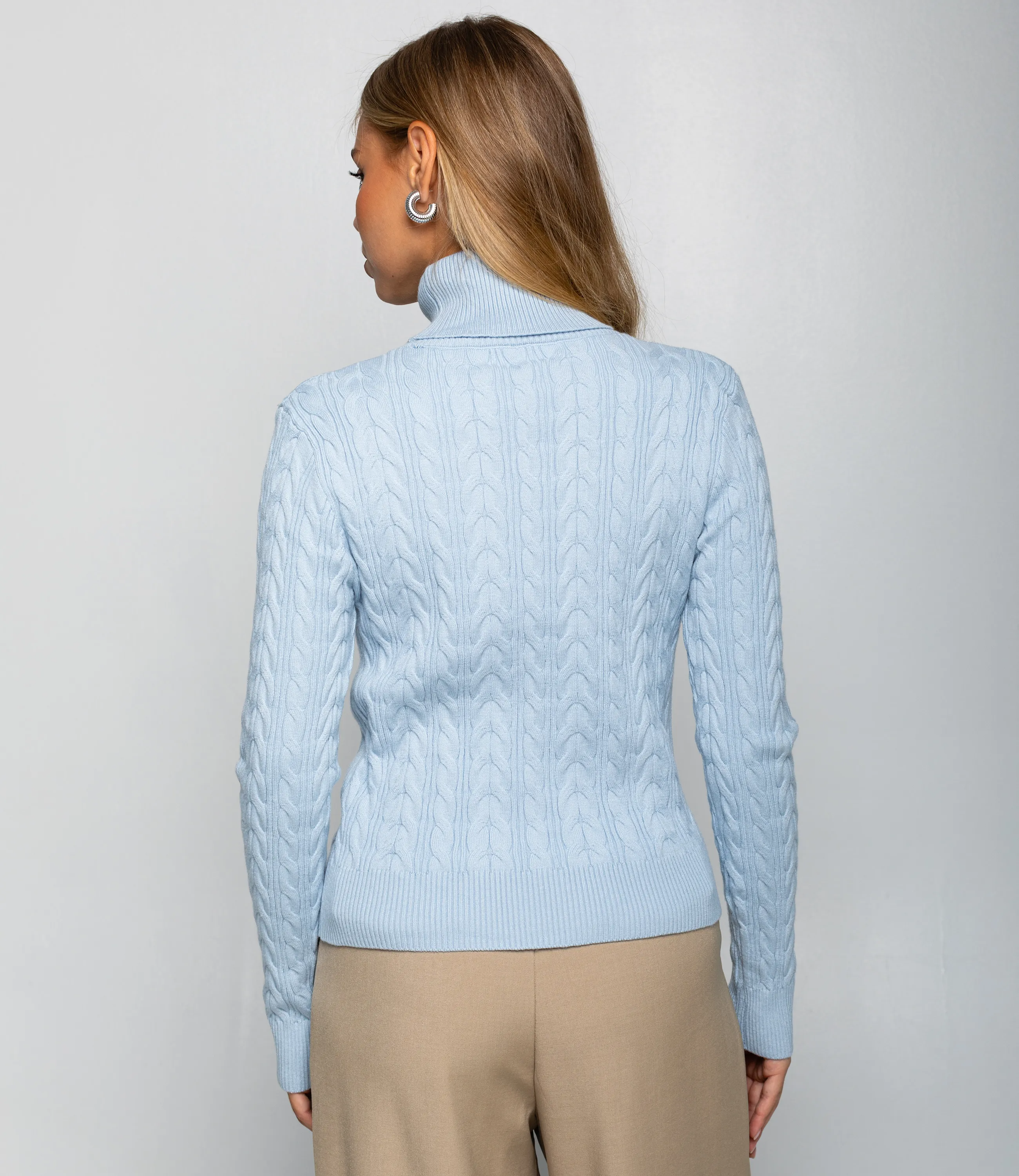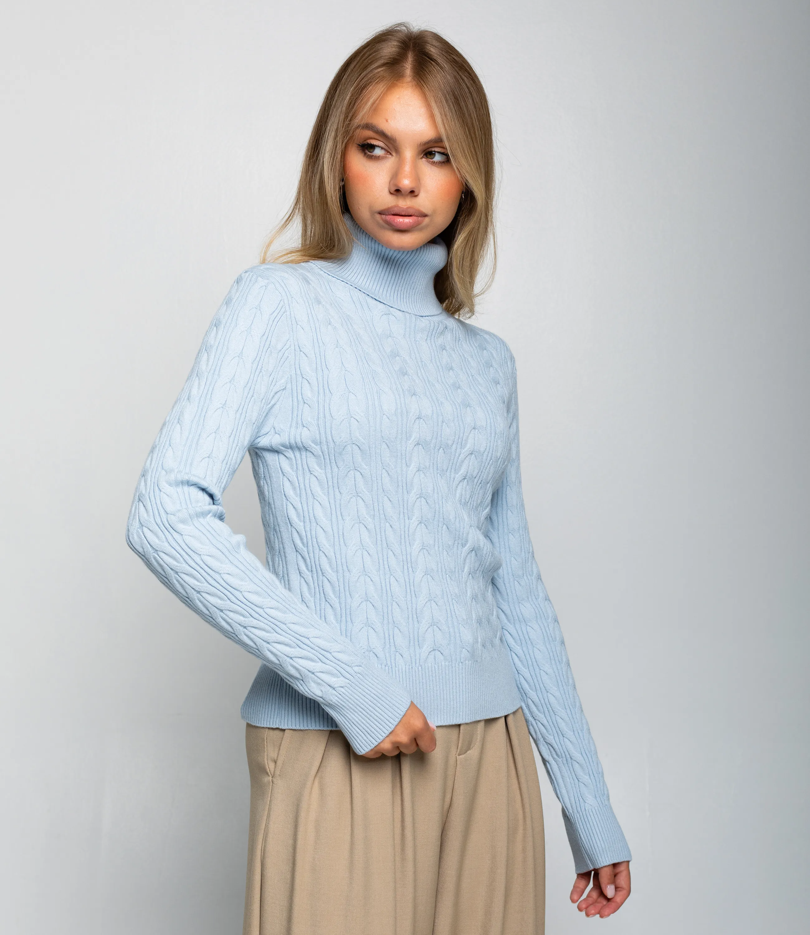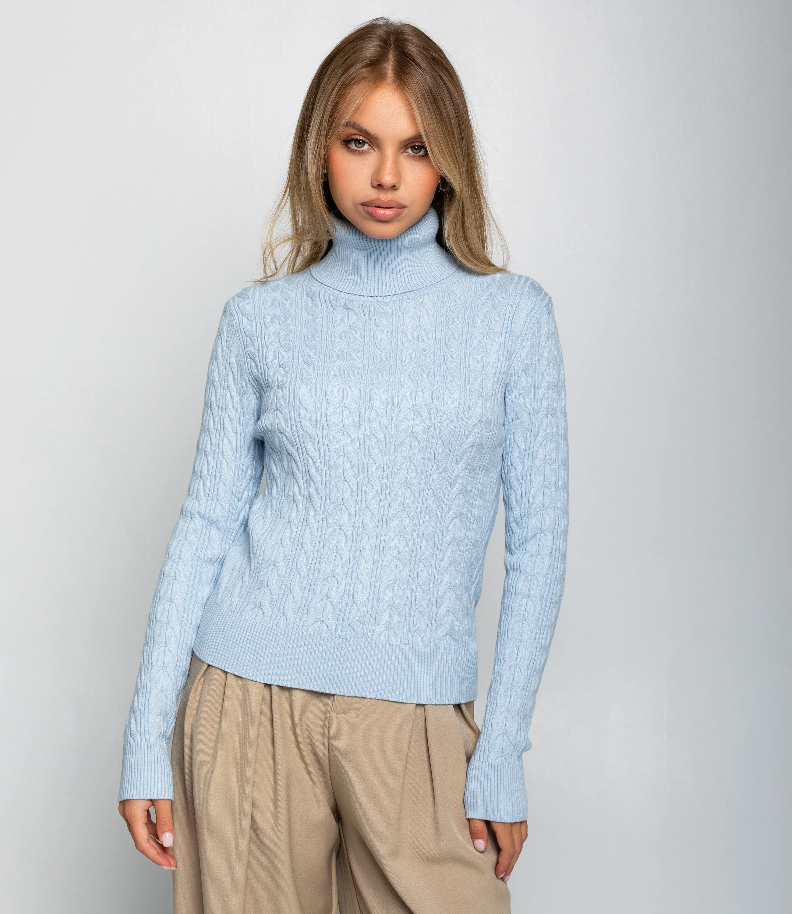 Водолазка – это одежда, которая подчеркивает женственность любой представительницы прекрасного пола. Водолазка приталенного силуэта средней длины до линии бедер, выполнена из средне‑плотного вязаного трикотажа с выраженным плетёным «косичка» узором по всему полотну, имеет высокую подгибную стойку, плотно облегающую шею, длинные прилегающие рукава с широкой вязаной резинкой на манжетах и широкую вязаную планку по низу для сохранения формы. Для изготовления использована ткань, состоящая из 90% акрила и 10% шерсти, которая характеризуется отличным качеством. Даже после большого количества стирок изделие не утратит первоначальной красоты. Вы сможете носить ее с радостью. Обратите внимание на цвет. Он является насыщенным и полностью соответствует фотографии на сайте. Чтобы вы были уверены в размере, мы представили на странице таблицу. Воспользовавшись ею, вы сможете сами обмерить себя и удостовериться. Установленная нами цена является приемлемой. Не откажите себе в удовольствии быть элегантной! Рост модели 168 см., 89-63-90.