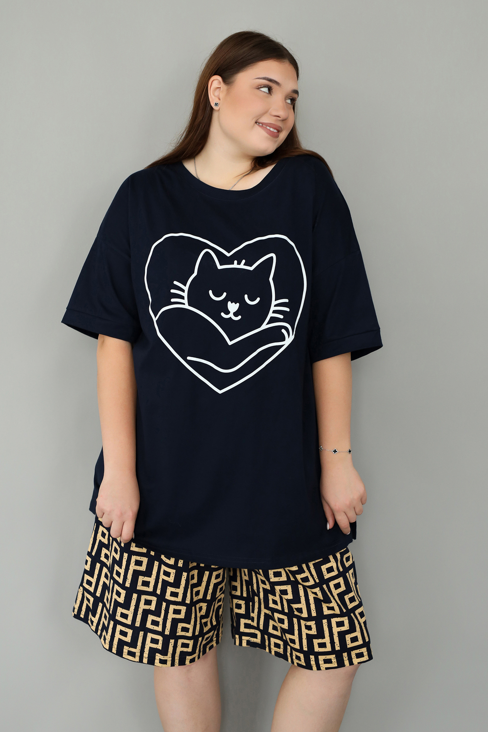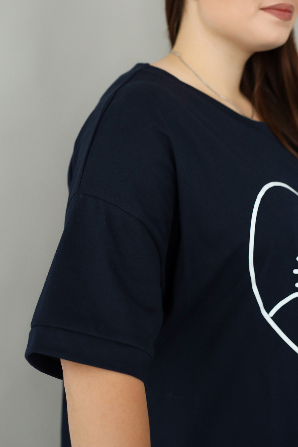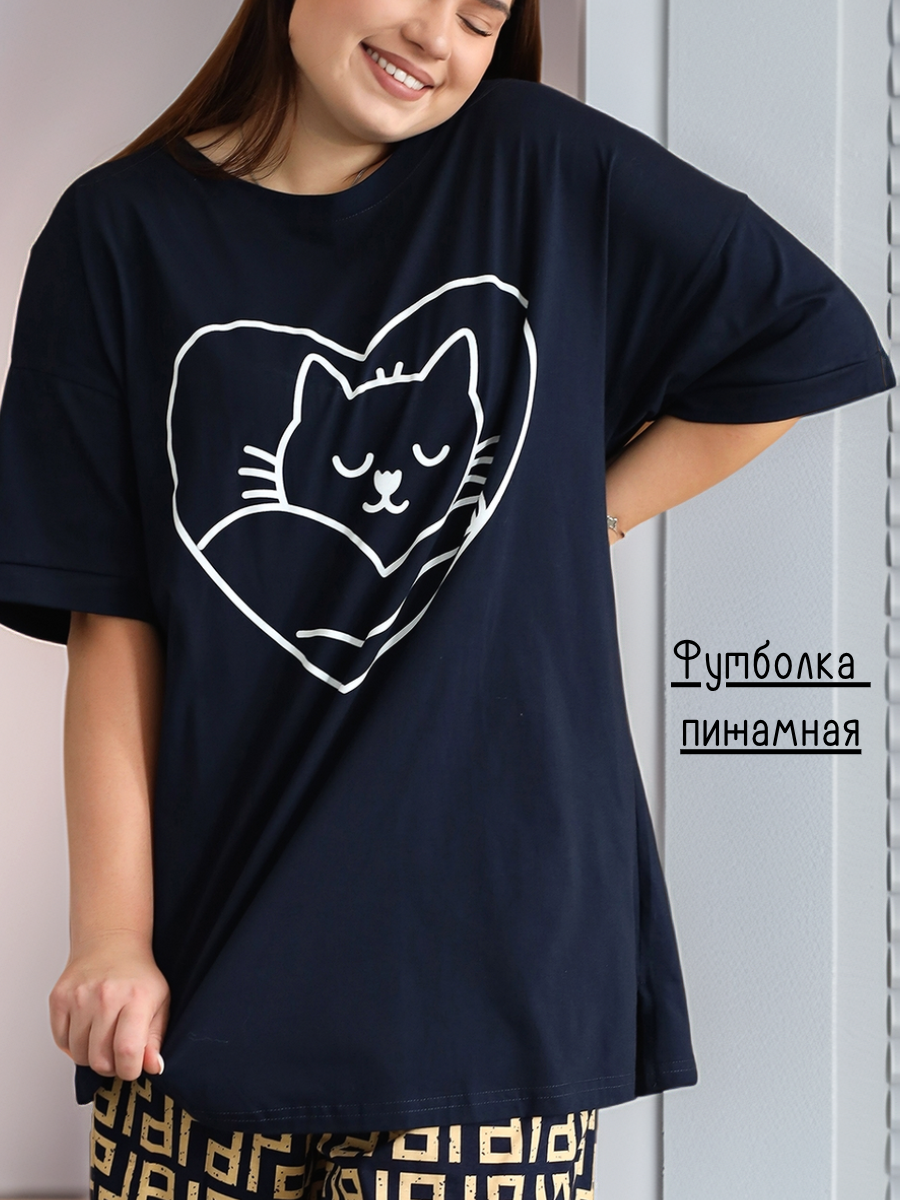 Футболка пижамная женская ВРазмере из коллекции Новогодняя для хорошего отдыха - это идеальный выбор для комфортного сна и отдыха дома. Эта мягкая и нежная футболка, сшитая из 100% хлопка , подарит вам ощущение легкости и приятной прохлады. Однотонная модель темно-синего цвета с милым принтом в виде кошечки создает уютную и женственную атмосферу. Благодаря свободному, оверсайз крою, футболка идеально подходит для женщин plus size, обеспечивая максимальный комфорт и свободу движений. Короткие рукава и отсутствие карманов делают ее удобной для сна, а легкая ткань кулирка не будет сковывать ваши движения. Эта пижамная футболка станет отличным выбором для тех, кто ценит комфорт и стиль. Она прекрасно подойдет как для сна, так и для домашнего отдыха, создавая атмосферу уюта и расслабленности. Цвет: темно-синий; Материал: кулирка;кулирка; Состав: 100% хлопок.