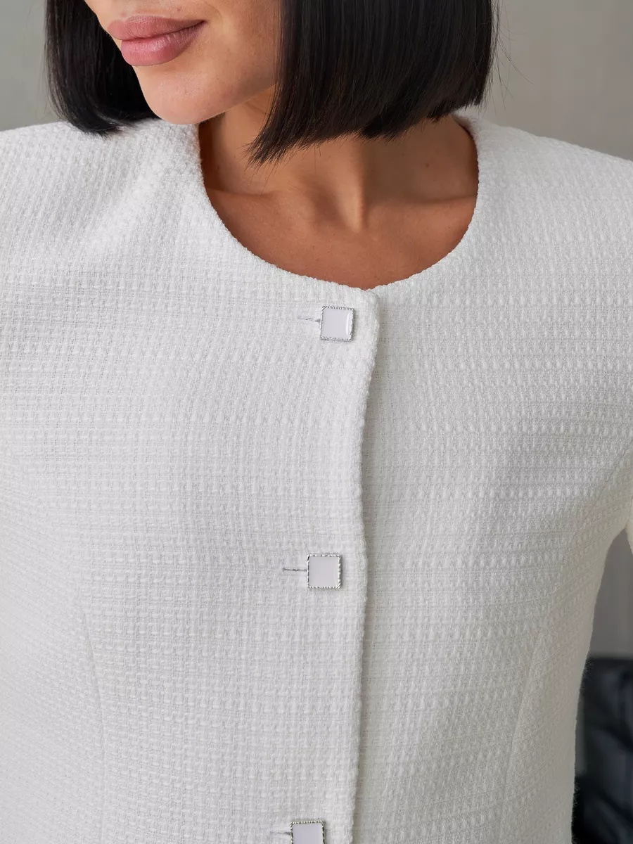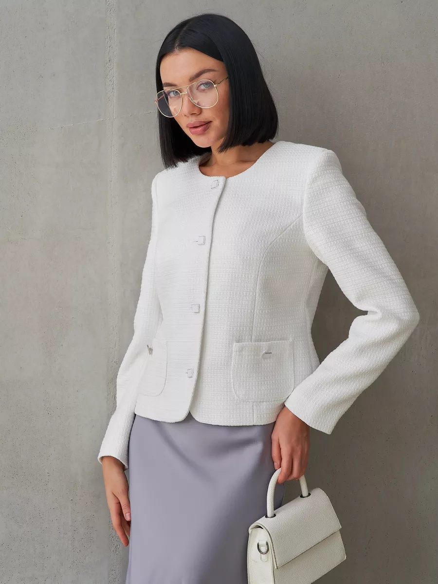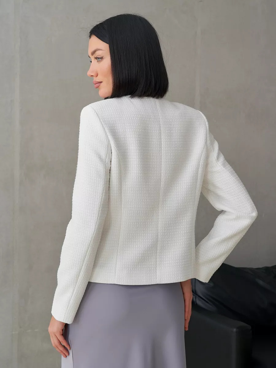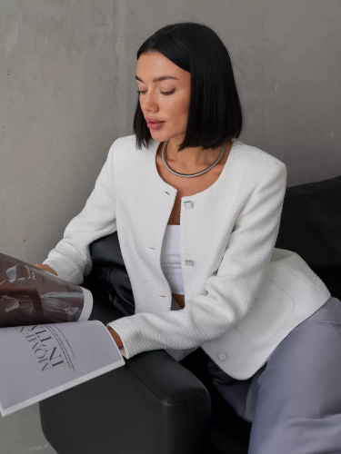Однобортный твидовый пиджак в стиле Шанель — элегантное решение для офиса, праздников и образов в духе Old Money. Приталенный укороченный крой подчеркивает фигуру и подходит как высоким, так и невысоким женщинам. Выполнен из качественного твида на вискозном подкладе, пиджак комфортен в носке и идеально садится по фигуре. Универсальный однотонный дизайн легко сочетается с гардеробом, а карманы добавляют практичности. Идеален для осени, зимы и торжественных случаев. Размеры от 42 до 52. Этот жакет станет стильной основой вашего делового или вечернего образа.
