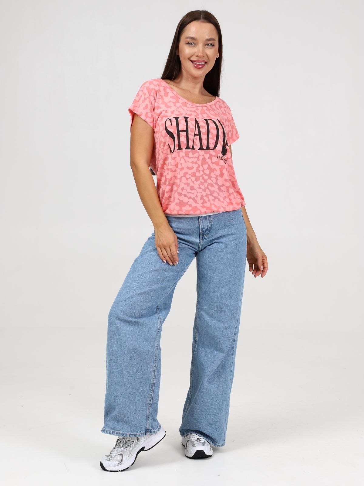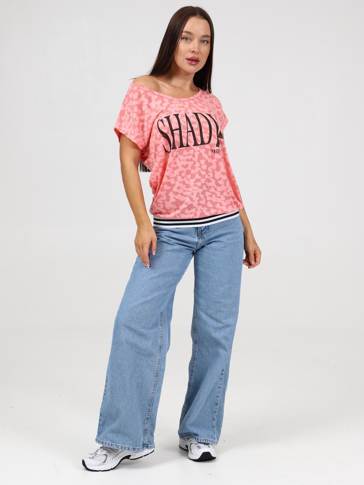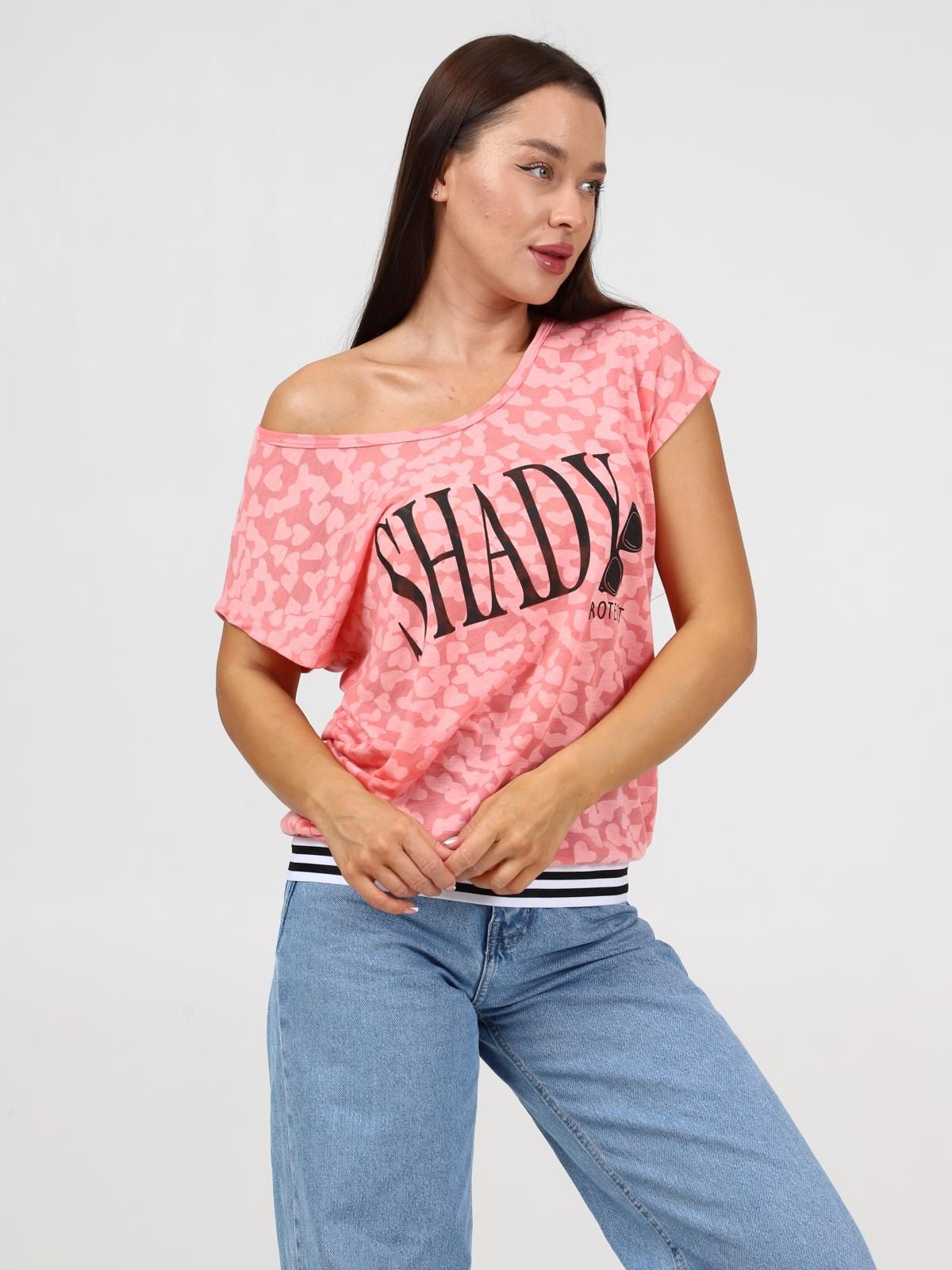 Женская футболка выполнена из трикотажного полотна "деворе". Футболка свободная со спущенным плечом, круглая горловина обработана обтачкой из основной ткани, низ футболки на поясе из декоративной эластичной тесьмы, передняя часть футболки декорирована принтом.