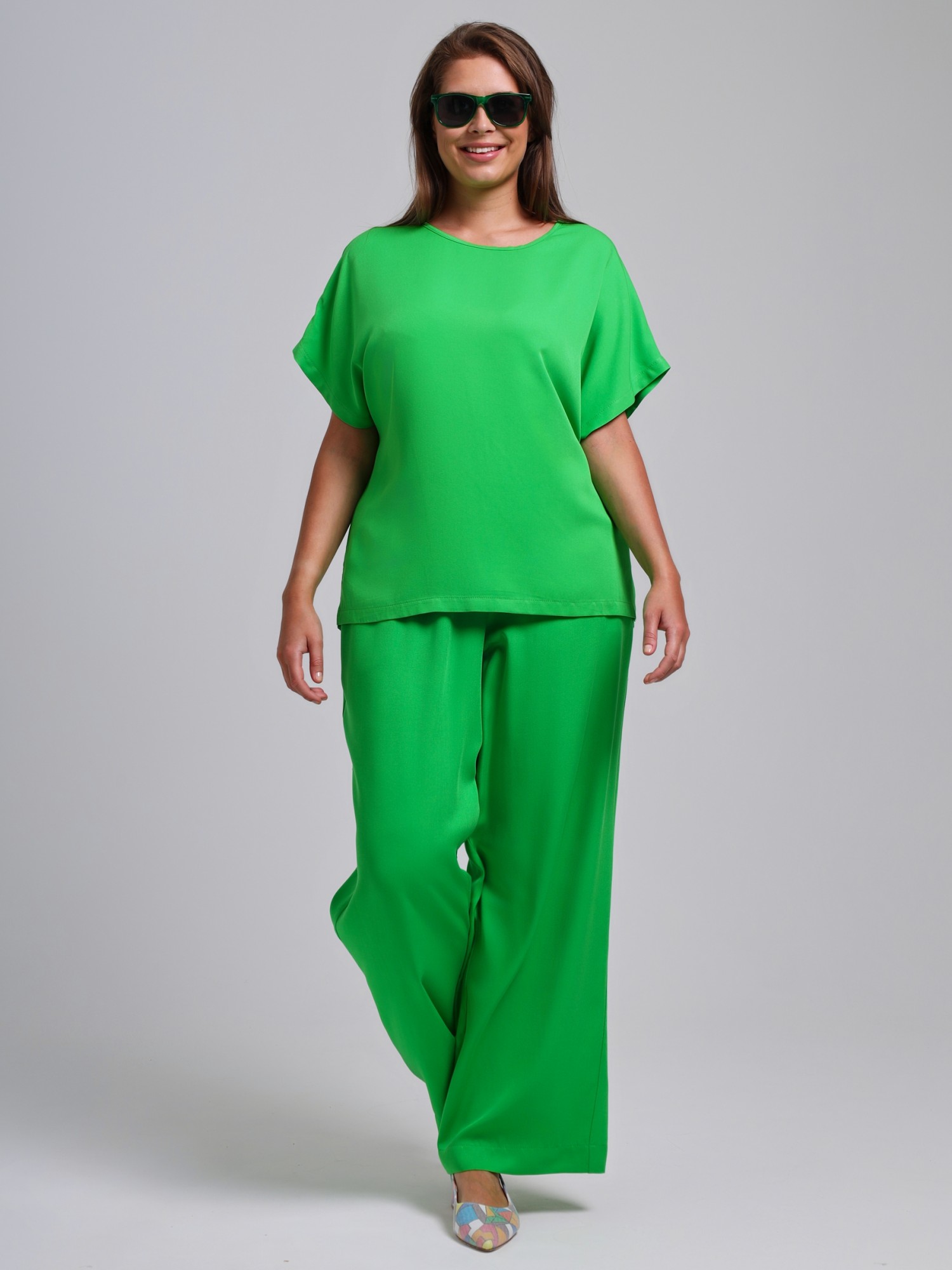 Брюки женские из гладкокрашеного тканого штапельного полотна, свободного покроя, удлиненные, с карманами в бокавых швах, на притачном поясе с эластичной тесьмой внутри.