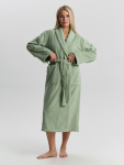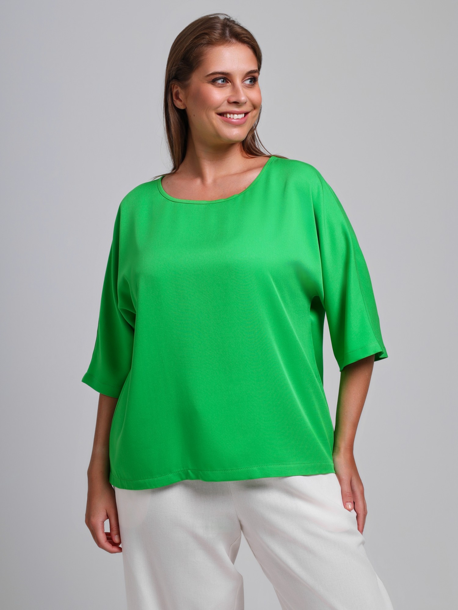 Блуза женская из гладкокрашеного тканого штапельного полотна, свободного кроя с горловиной овальной формы, обработанной окантовкой из основного материала, с цельнокроеными рукавами длиной до локтя.