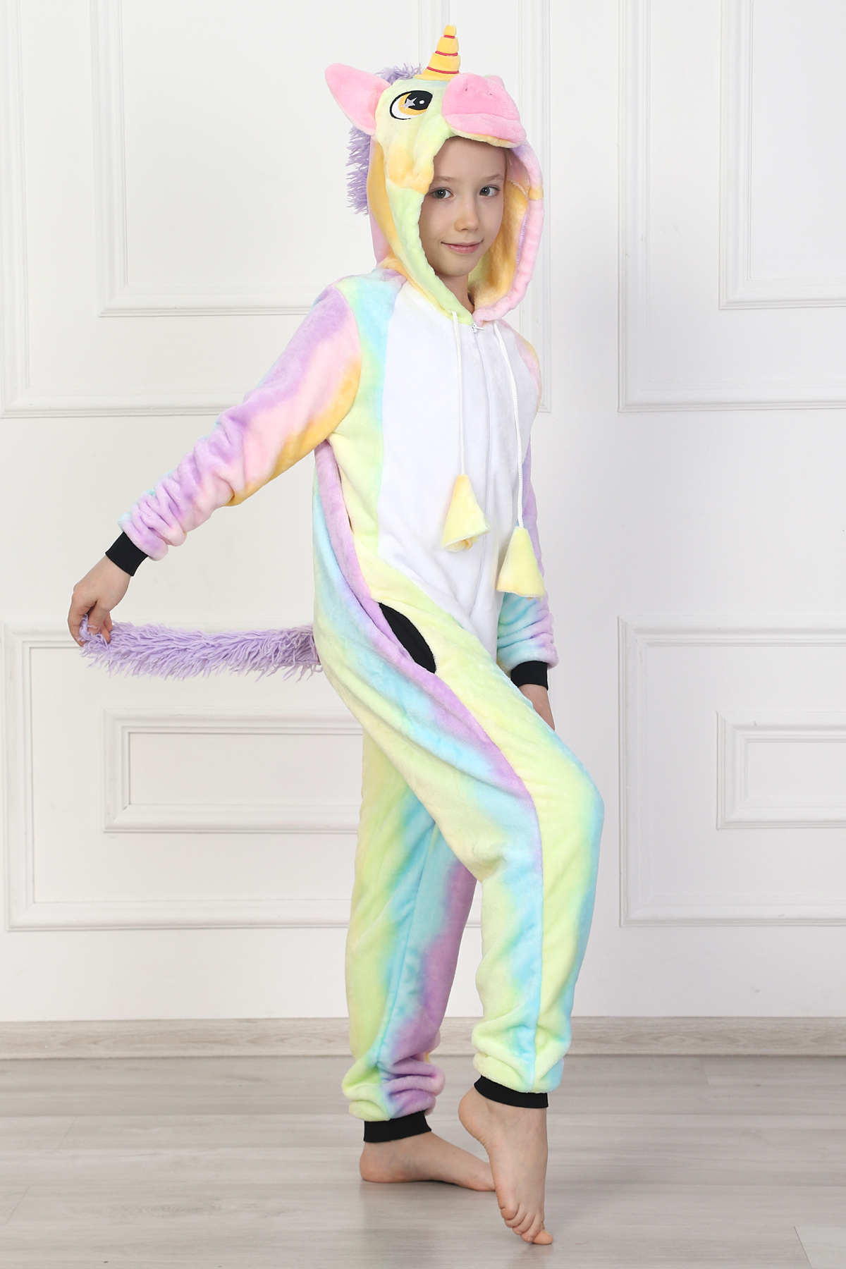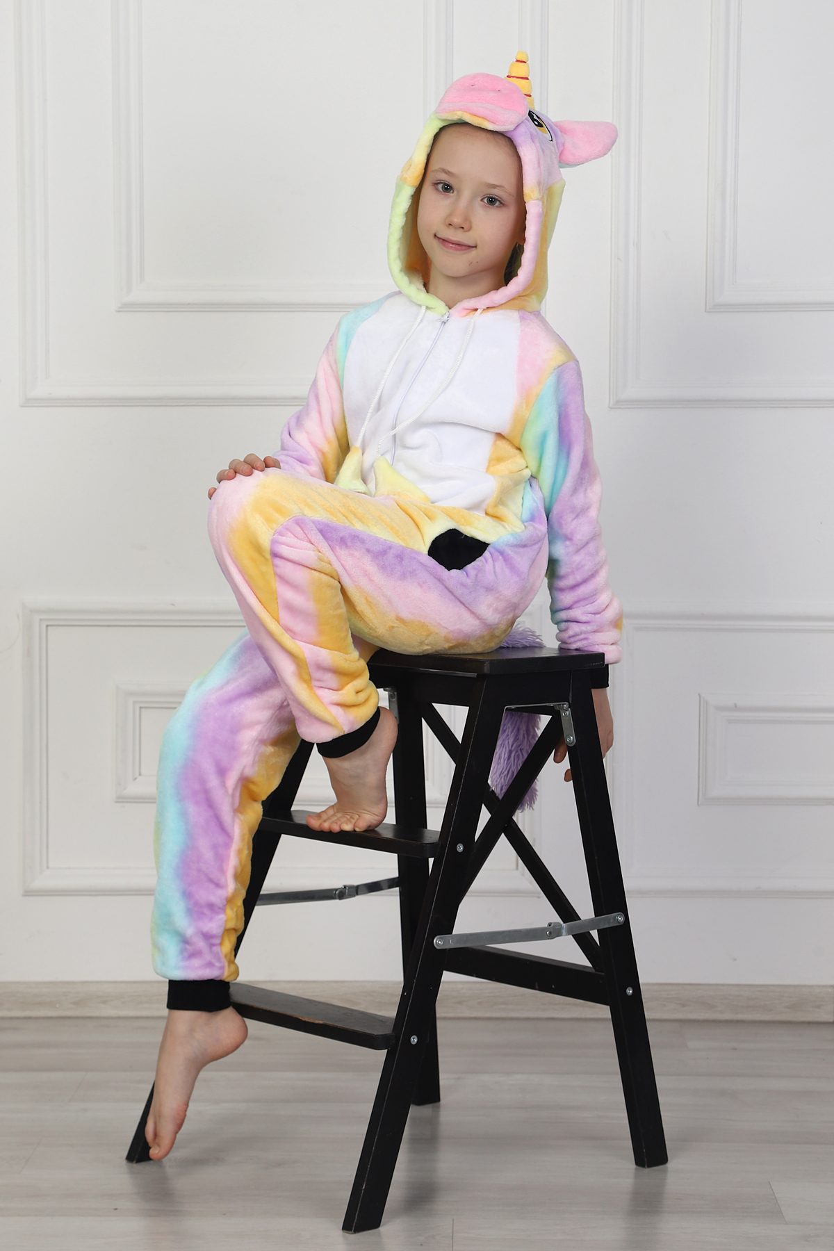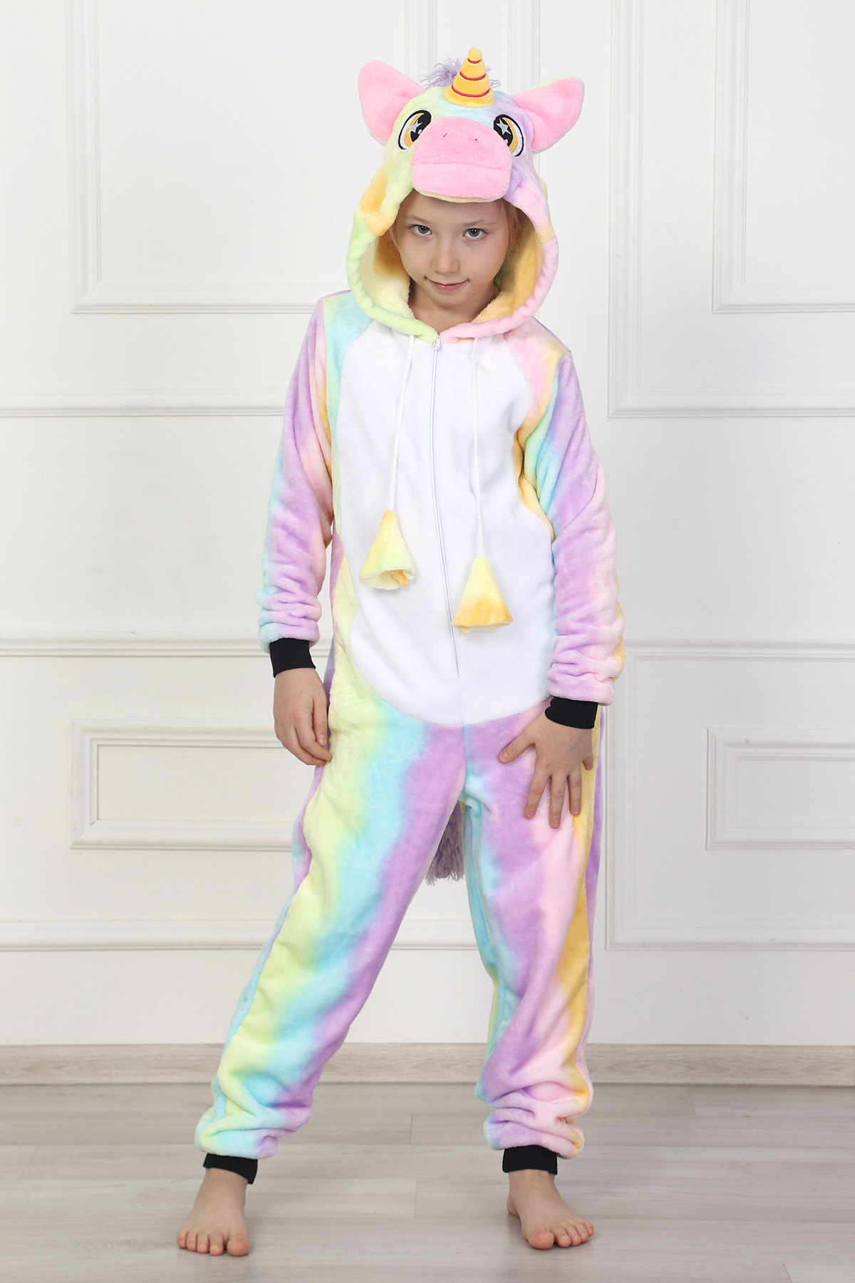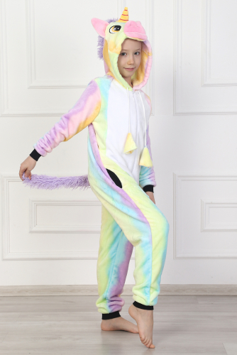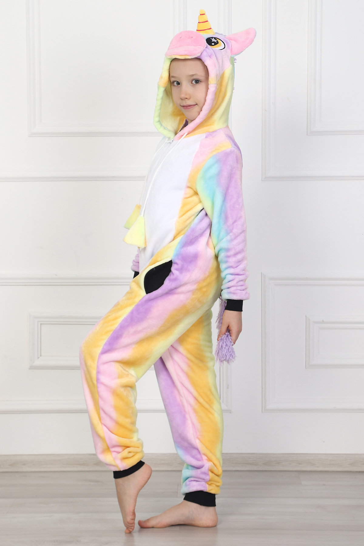 Комбинезон детский на молнии, с подкладкой в верхней части изделия, с капюшоном, стилизованный в виде животного - единорога, двумя боковыми карманами в швах. Рукава втачные на манжете, на полочке вставка, имитирующая манишку. На капюшоне тематическая вышивка, шнурок с «бомбошками». Манишка и ушки выполнены из отделочной ткани, манжеты – из отделочной рибаны. На капюшоне - грива, на спинке - хвостик.