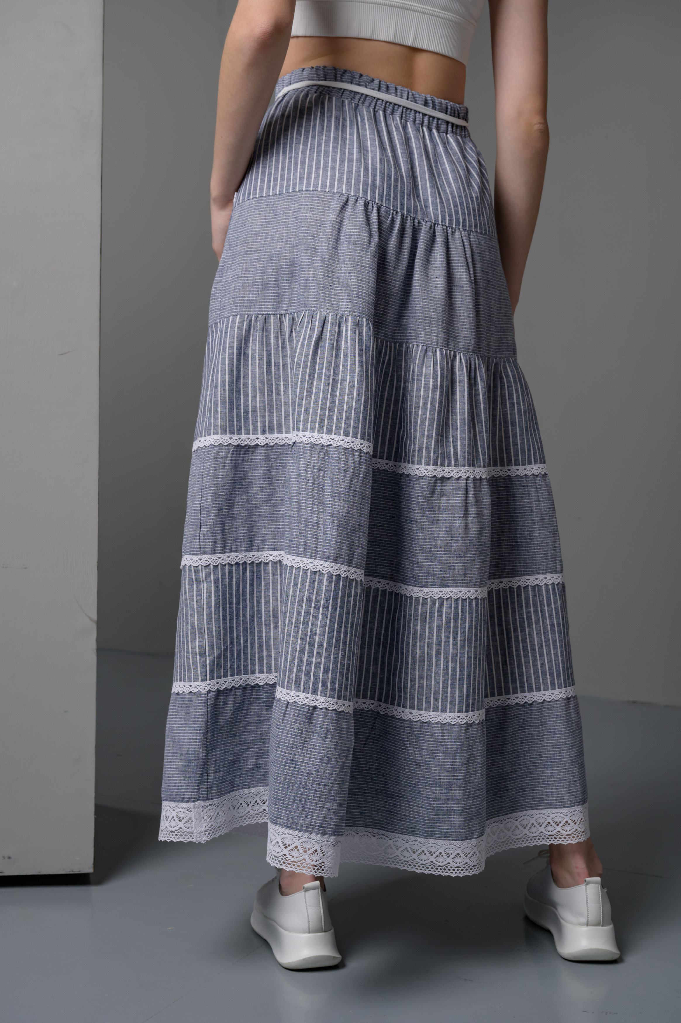 Легкая летняя юбка из муслина. Оригинально смотрится ткань с эффектом варки.  Крой юбки ярусами, которые фиксируются в сборку, что придает объем и воздушность изделию. Юбка не имеет застежки, по линии талии широкий пояс, который плотно фиксирует юбку на фигуре. Х/б шнур, вставленный в петли-шлевки, выполняет лишь декоративную роль. Изделие не требует глажки после цикла стирки.  Просвечивание исключено.