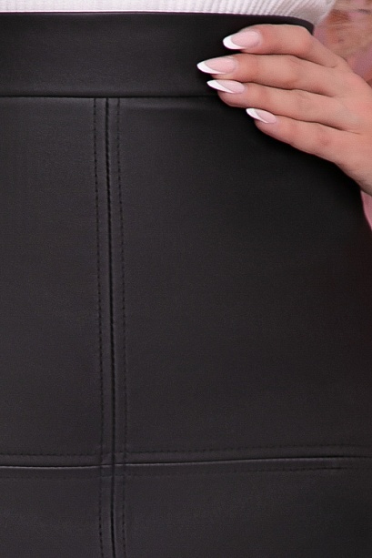 Юбка трапецевидного силуэта из эко кожи с притачным поясом и застежка молния по спинке.