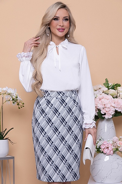 Юбка из трикотажного полотна джерси в клетку на притачном поясе с застежкой на пуговицу сзади.По спинке потайная молния и шлица с среднем шве.