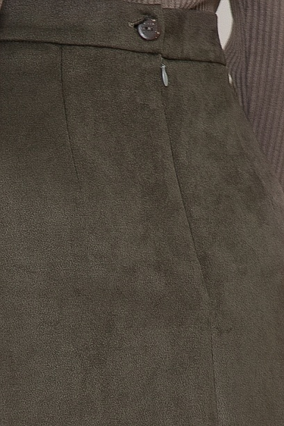 * Юбка трапеция из искусственной замши на притачном поясе и застежкой в среднем шве спинки на пуговицу и потайную молнию.