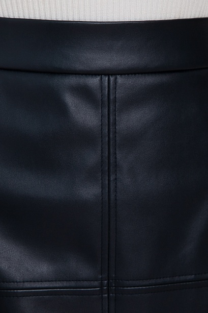 * Юбка трапецевидного силуэта из эко кожи с притачным поясом и застежка молния по спинке.