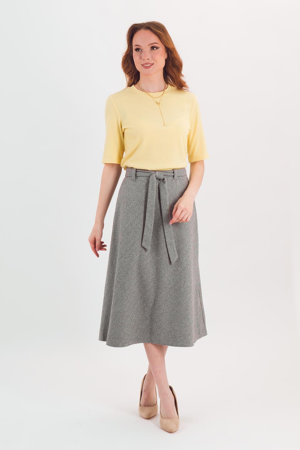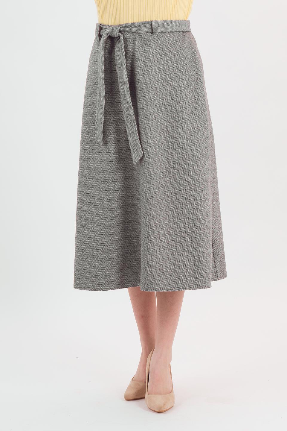 Описание: Элегантная юбка-колокол длины миди умеренного объема струится вокруг Ваших ножек. Акценты в данной модели представлены шлевками и аккуратным завязывающимся поясом.