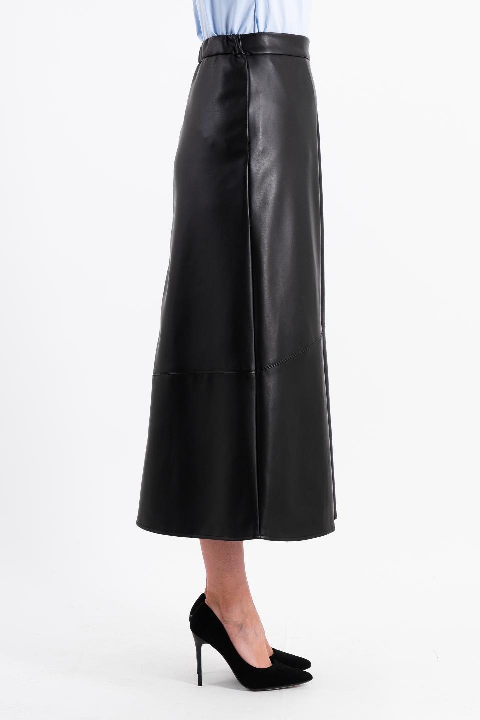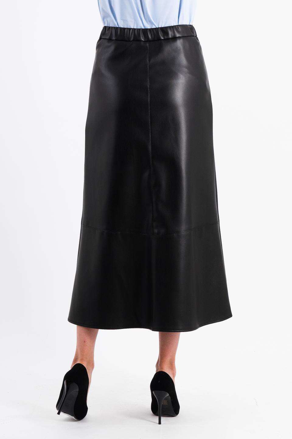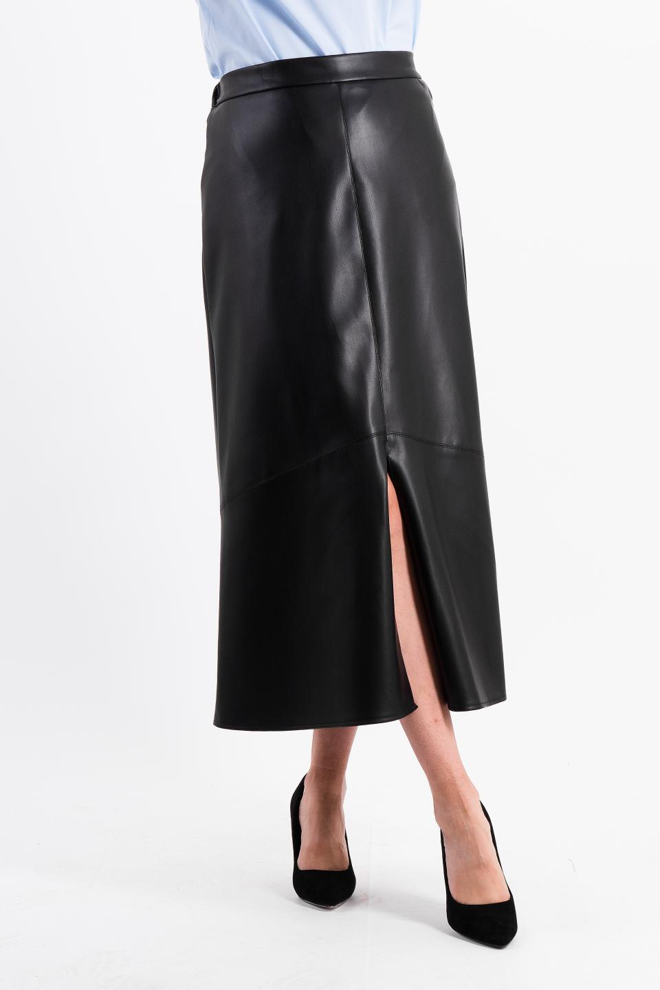 Описание: Актуальная длина юбки-макси из экокожи разделена декоративными подрезами с отстрочками. Разрез спереди дарит комфортную ширину шага. Резинка в талии пояса по спинке обеспечит удобство.
