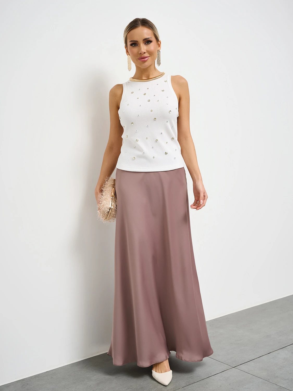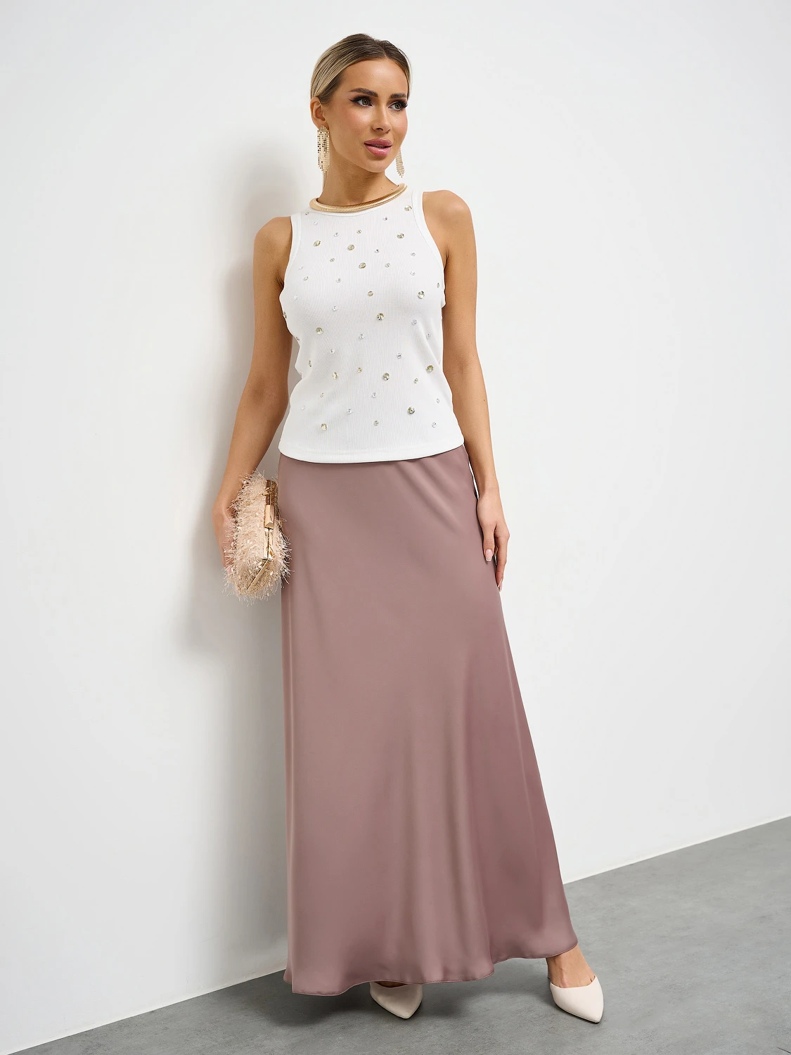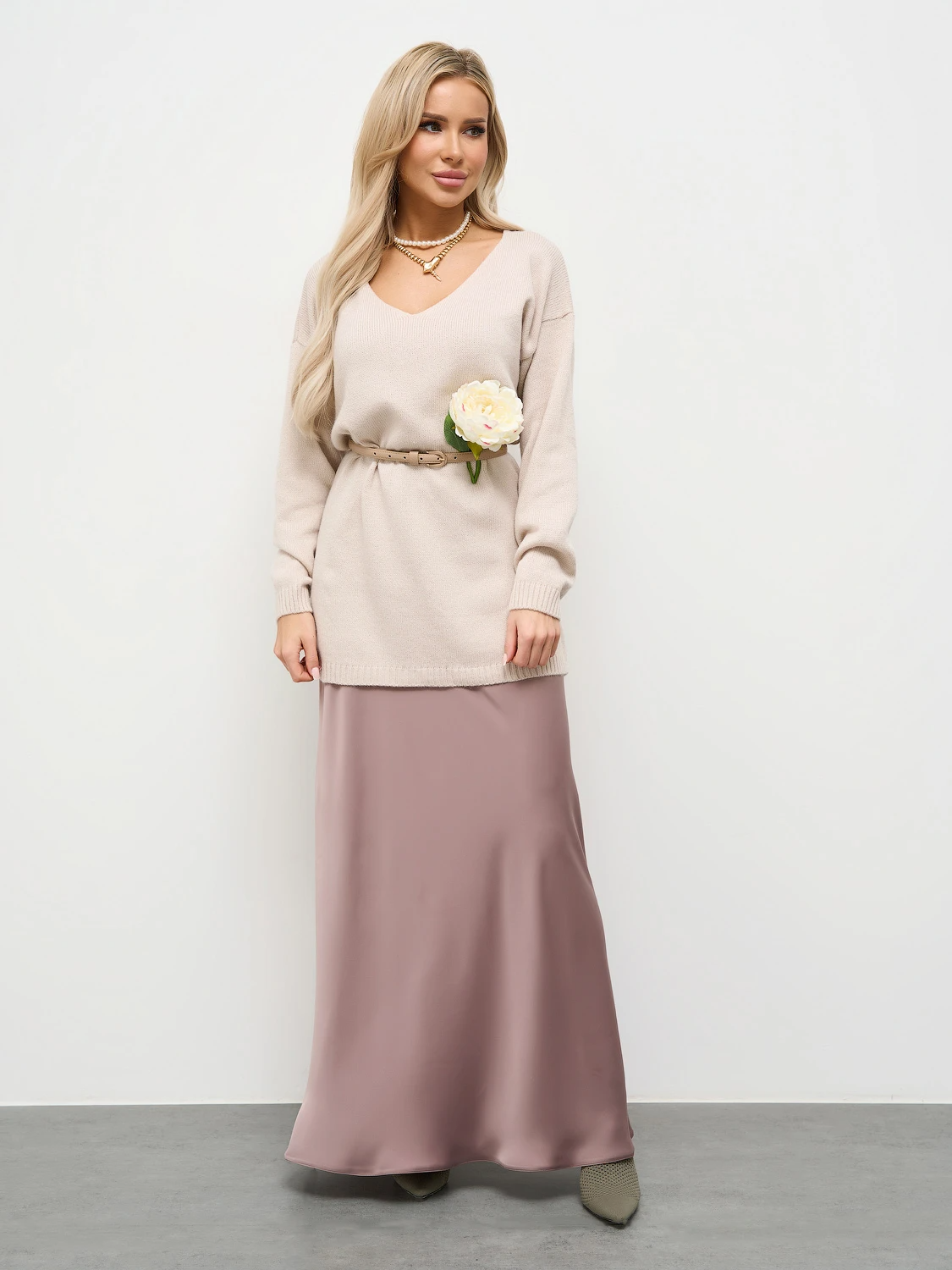 Юбка длины макси из плотного атласа с внутренним поясом из резинки.