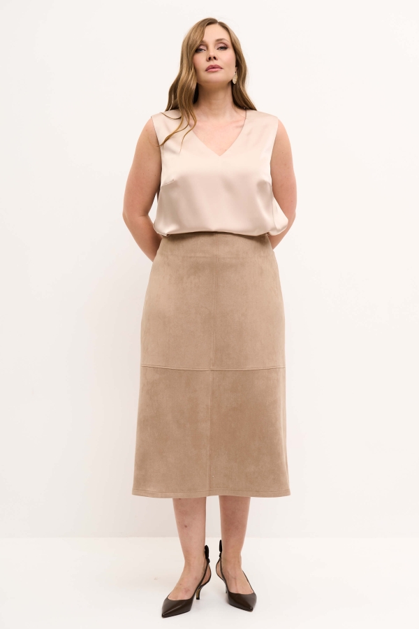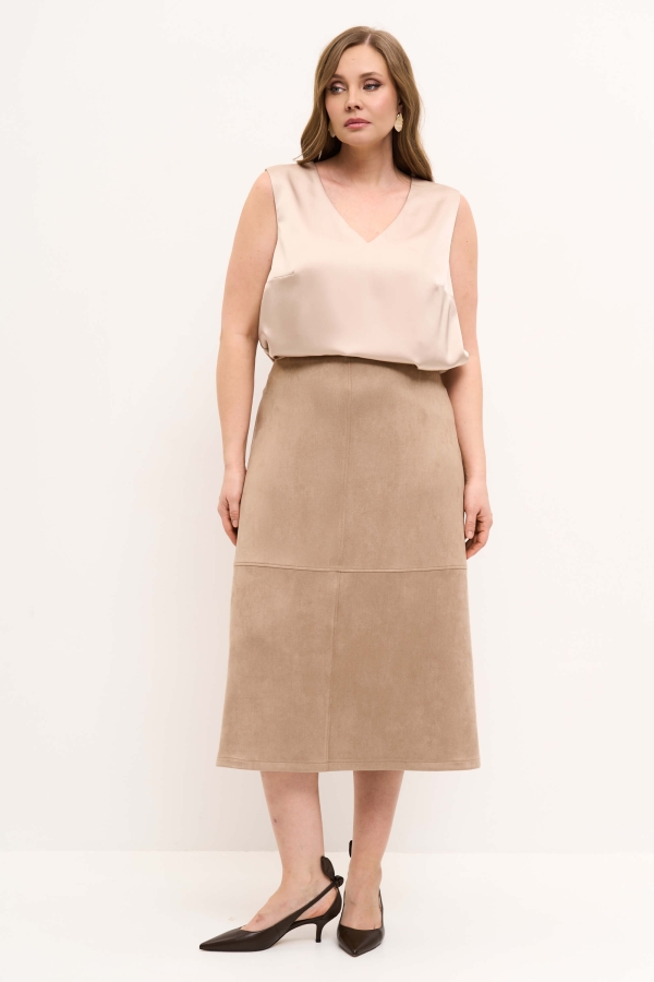 Элегантная юбка из эко-замши. Модель А-силуэта с комфортной посадкой на обтачке. По переду акцентные рельефы. По спинке застежка на молнию. Изделие на поливискозном подкладе.