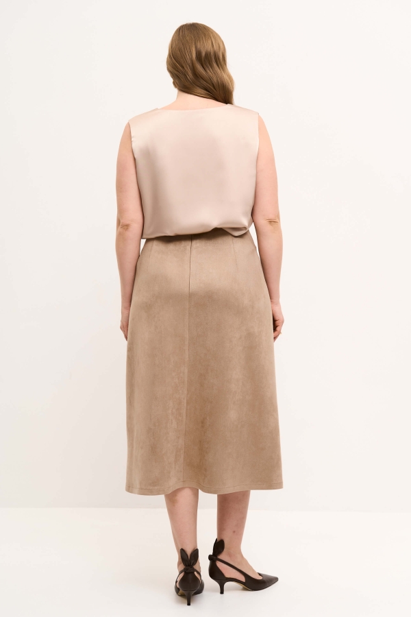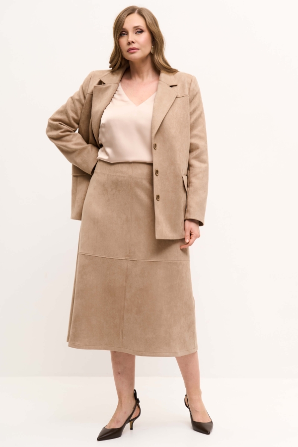 Элегантная юбка из эко-замши. Модель А-силуэта с комфортной посадкой на обтачке. По переду акцентные рельефы. По спинке застежка на молнию. Изделие на поливискозном подкладе.