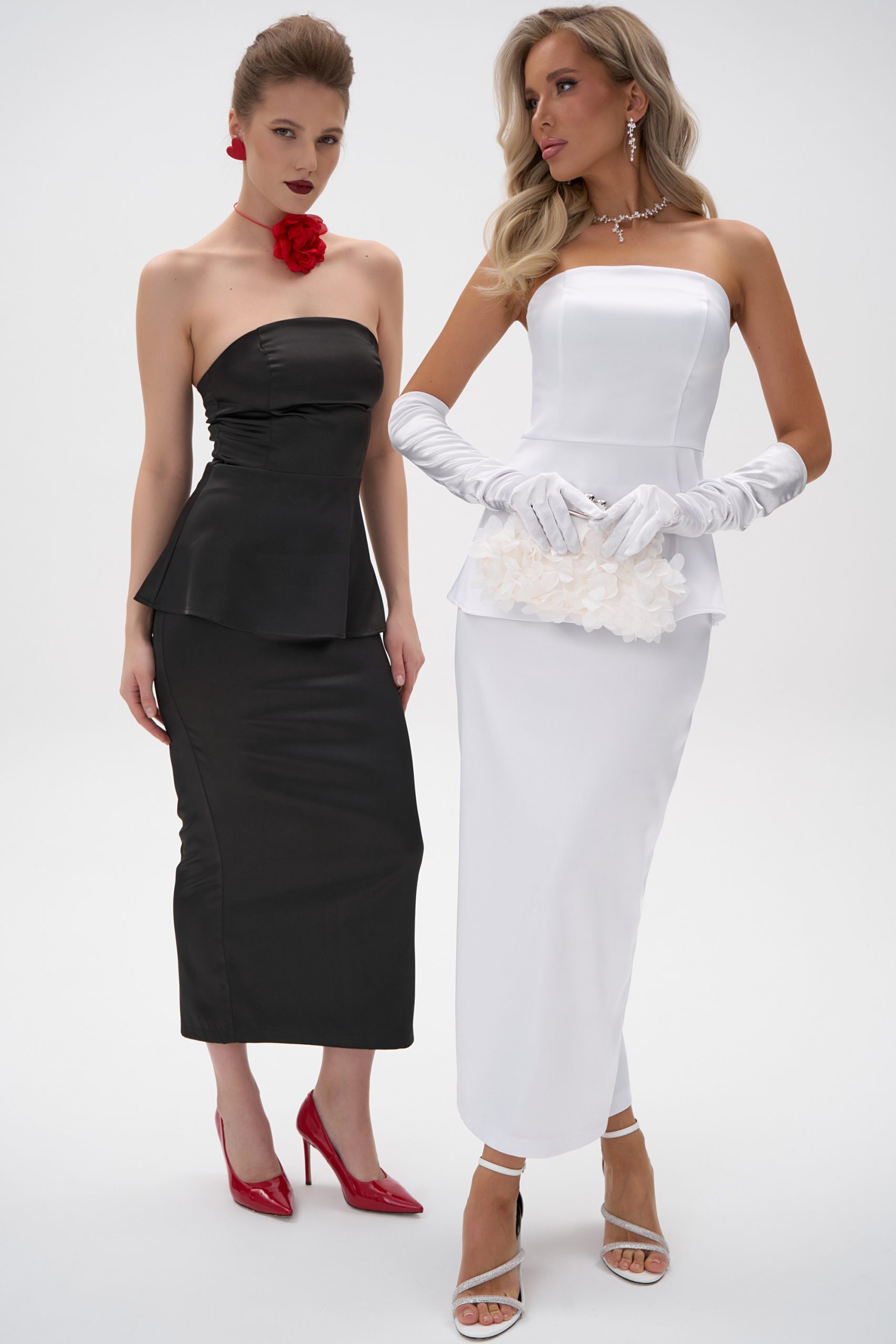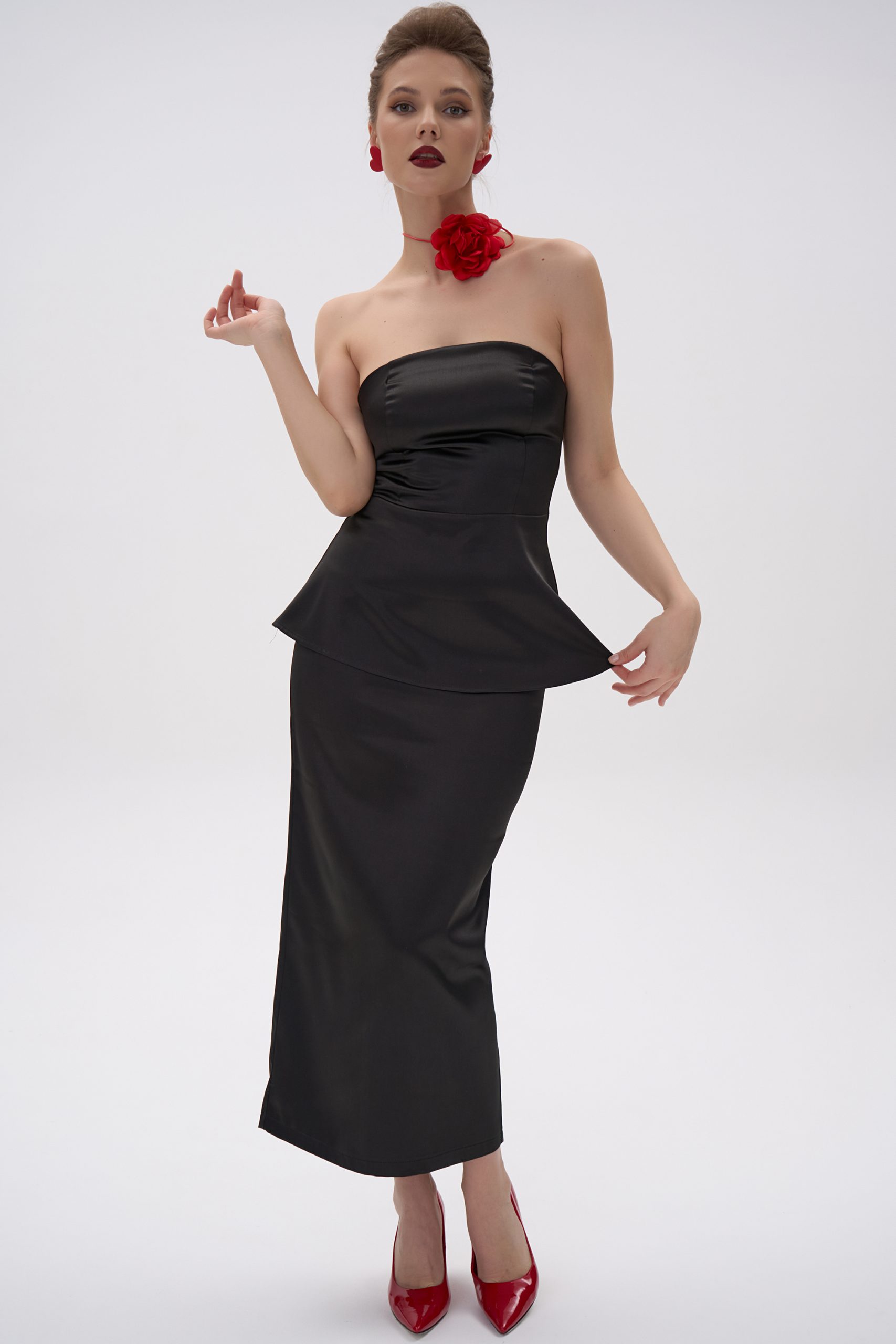 Костюм состоит из структурированного топа без бретелей и юбки миди прямого силуэта.
