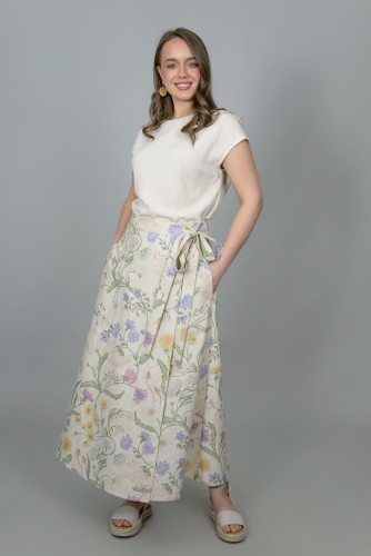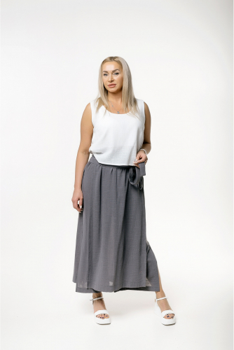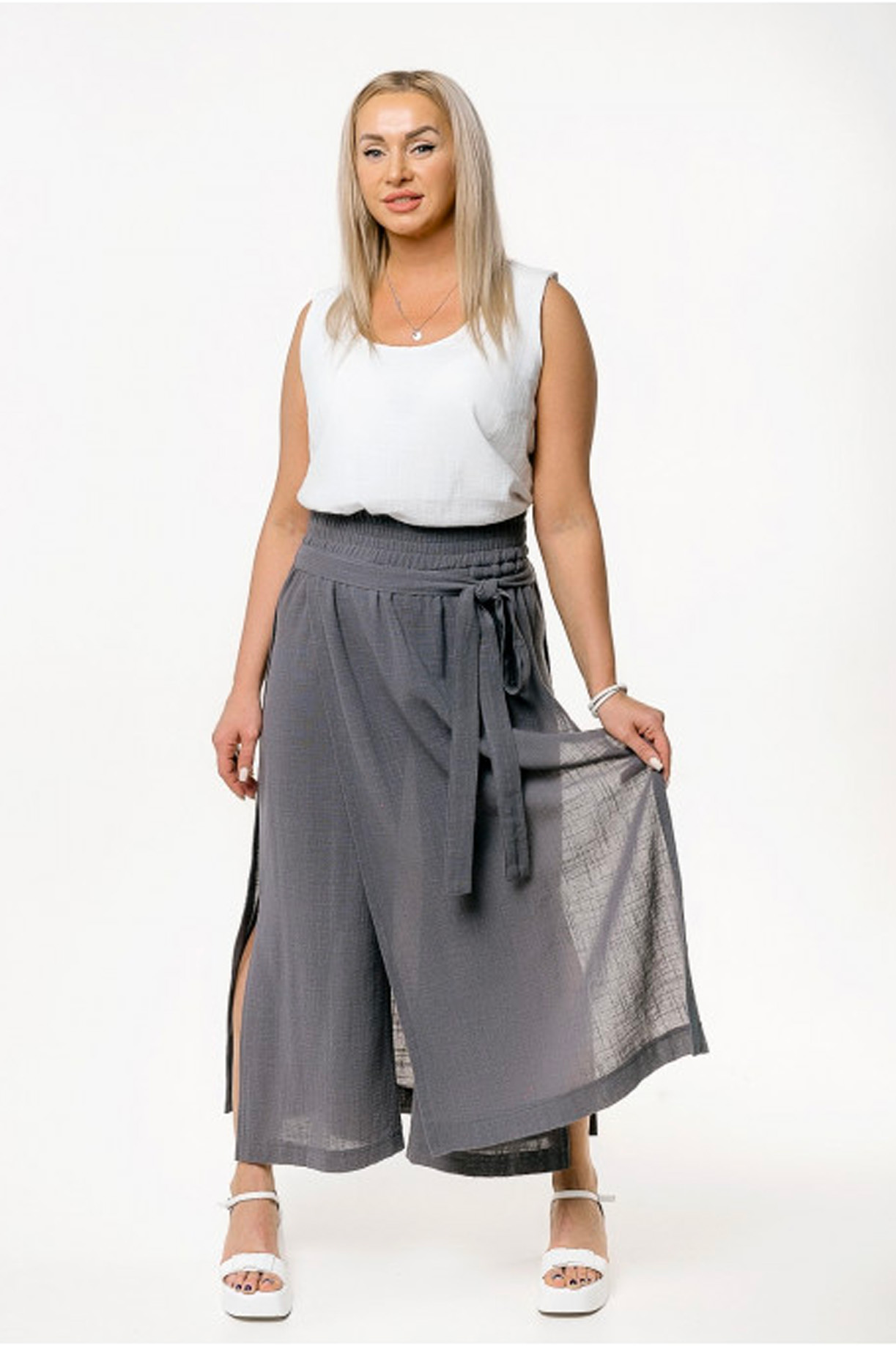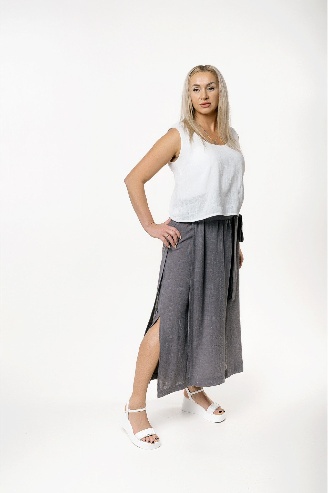 Юбка- брюки из ткани «марлевка», состав 100% х/б. При своей многослойности изделие очень легкое и воздушное, но не прозрачное. По передней части предусмотрен, как декор, пояс с разными вариантами завязывания. Изделие не имеет застежки, по талии широкий пояс, который плотно фиксирует юбку на фигуре.