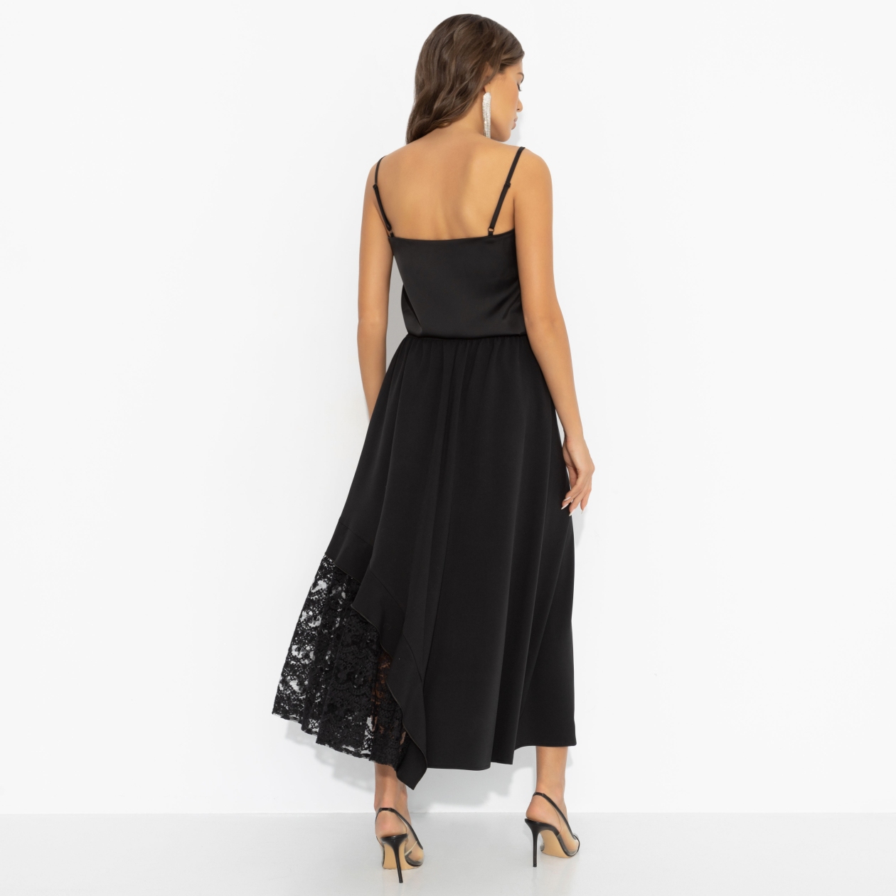 На первый взгляд это сдержанная чёрная юбка, подходящая для сотни поводов. Но стоит вам сделать шаг, и кружевной слой приоткрывается, добавляя в образ интригу и обещание продолжения истории после официальной части вечера. Юбка для тех вечеров, когда хочется быть центром чувств. Асимметричный подол мягко раскрывает вышитое кружево на сетке, создавая ощущение многослойности и глубины. Юбка миди легко сочетается с лаконичными топами и жакетами, превращая строгий образ в утончённый и запоминающийся. Пояс на резинке.