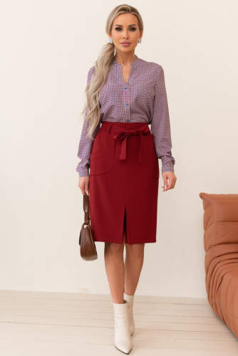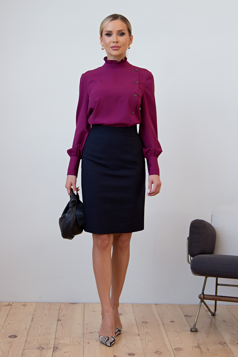 Офисная юбка-карандаш из однотонной плательно-костюмной ткани. Верх оформлен втачным поясом. В среднем шве спинки застежка на пуговицу и потайную молнию. Модель на подкладе. Низ ровный, сзади шлица.