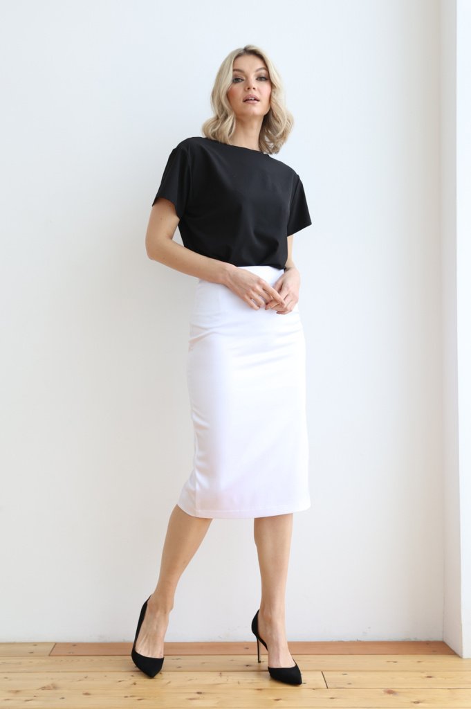 Юбка –футляр из атласа шлица и застежка на потайную молнию в среднем шве спинки. Плотная ткань с мягким атласным блеском.