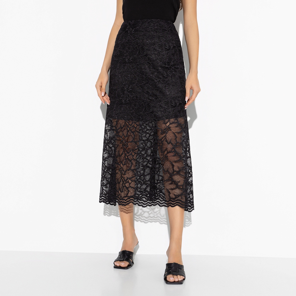 Предлагаем поднять бокалы за то, что женственность стала горячим трендом. Кружевная юбка на пике популярности. Изящное заигрывание с миром маскулинности, где победа будет однозначно на вашей стороне. Юбка из кружева в длине миди. Чуть расклешена к низу. Есть подклад. Юбка застегивается на скрытую молнию по задней части изделия.