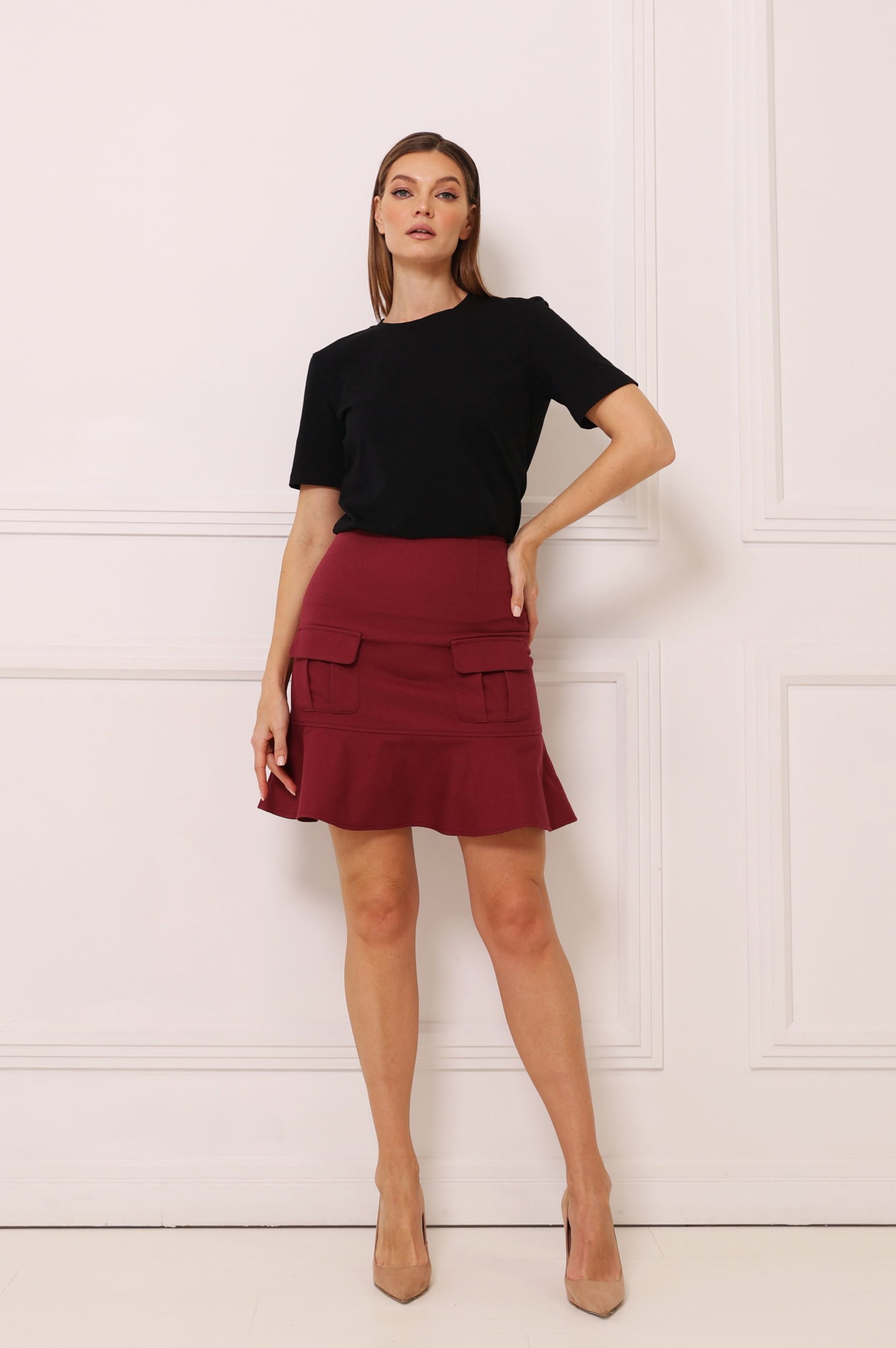 Юбка мини с воланом по низу. По переду накладные карманы с клапанами. Застежка-молния по спинке. Модель выполнена без подкладки.