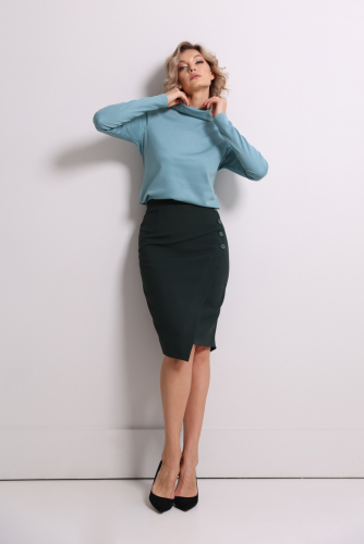 С декоративной отстрочкой, притачным поясом, карманами в боковых швах, застежкой на молнию в среднем шве спинки и шлицей.