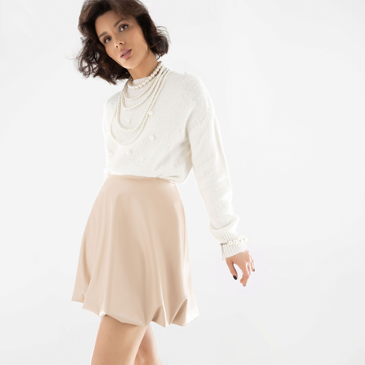 Трендовая юбка-баллон в исключительном исполнении из премиальной экокожи. Изделие цвета слоновой кости станет символом приверженности тихой роскоши. Юбка расклешенного кроя в длине мини. Посадка на талии. Юбка застегивается на скрытую молнию сзади. Есть трикотажный подклад.