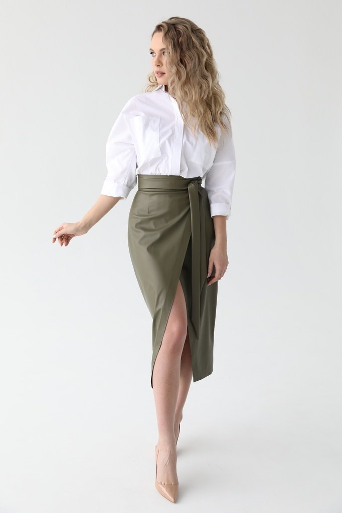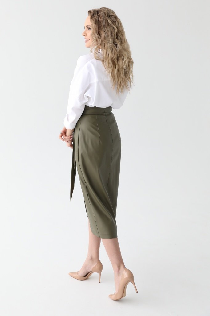 Юбка миди с запахом, притачным поясом и застежкой на молнию в среднем шве спинки.