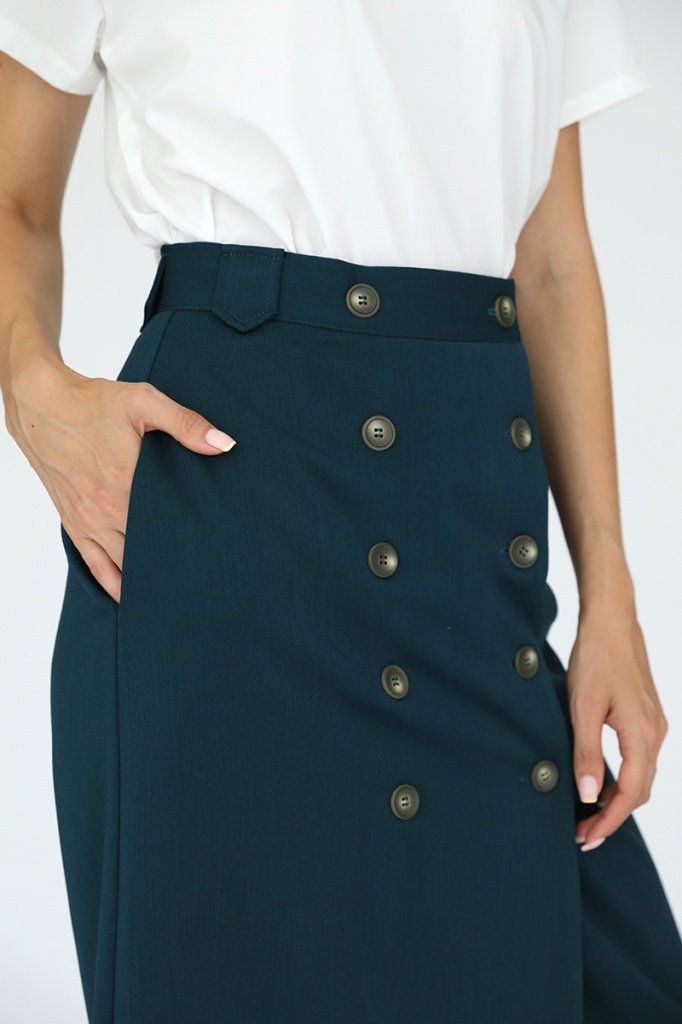 Юбка миди на запах с застежкой на пуговицы по переду. Притачной пояс со шлевками, боковые карманы в швах.