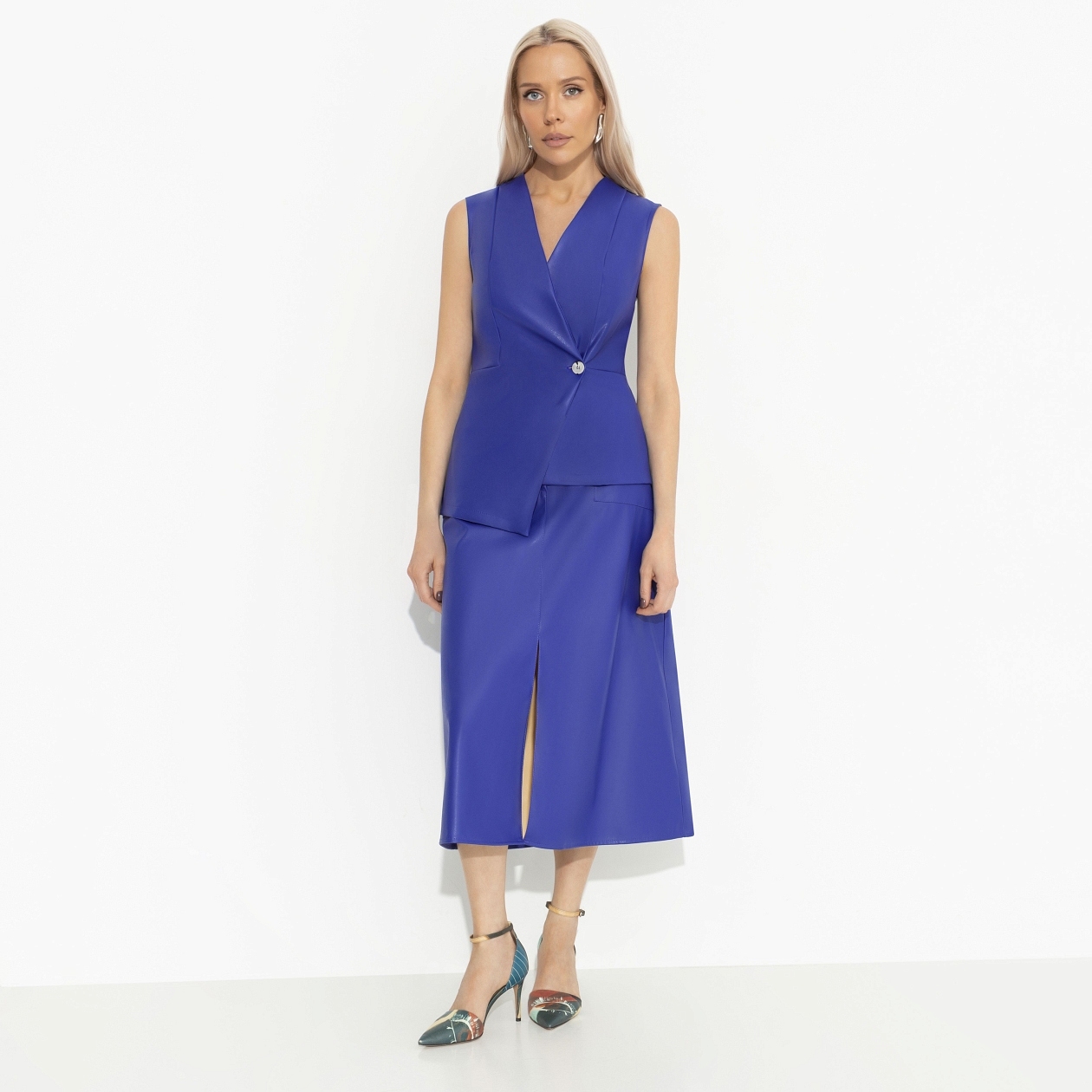 Сколько бы ни было в вашем шкафу вещей CHARUTTI, всем им нужно потесниться, потому что юбка из экокожи в цвете «светящийся синий» ждать не может. Так и просится на бедра, ничего не поделать. Юбка в длине миди А-силуэта. Посадка на талии. Юбка застегивается на молнию и пуговицу. Изделие с карманами. Есть деликатный разрез по центральной части.