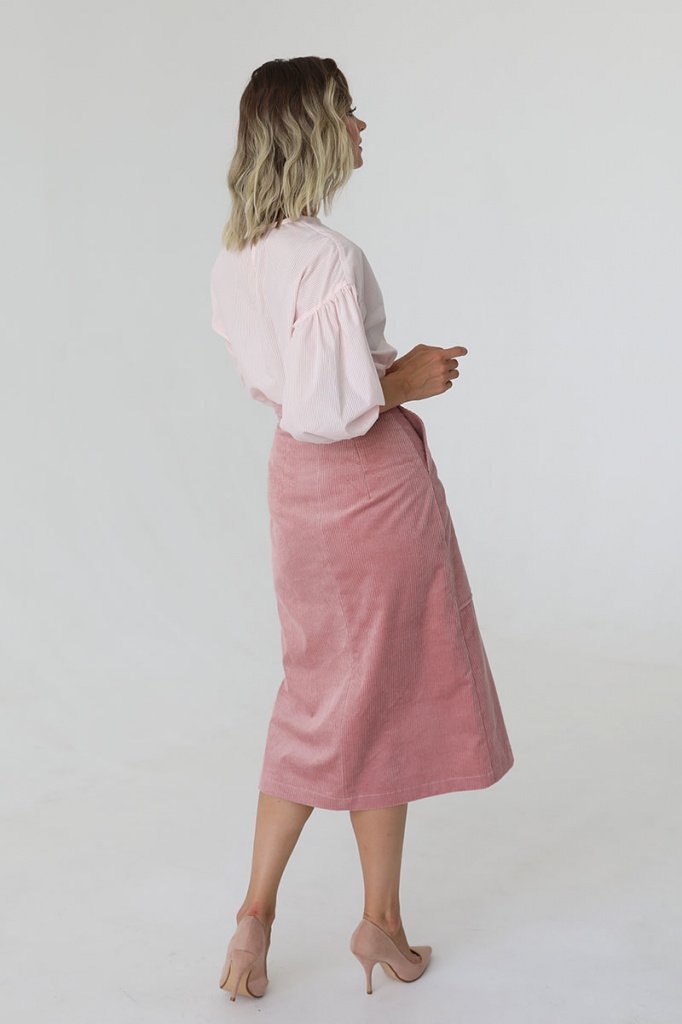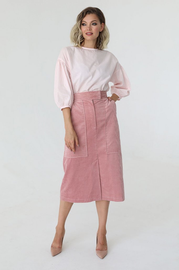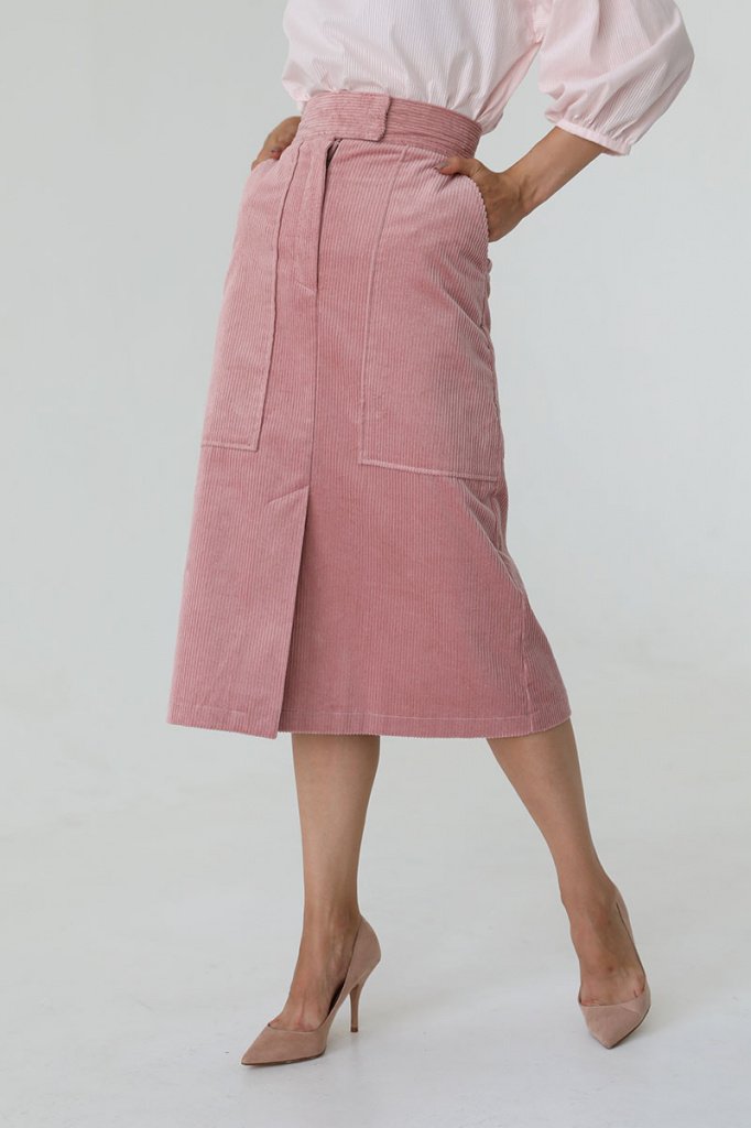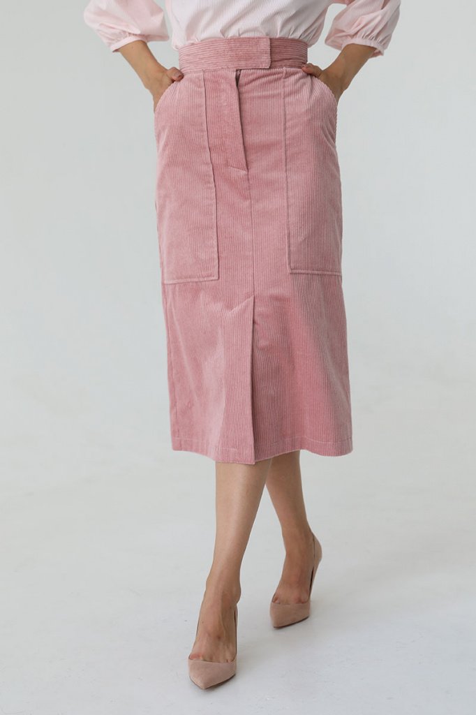 Юбка с разрезом и накладными карманами по переду, поясом, застегивающимся на внутренний крючок и молнию. На спинке изделия - вытачки на талии и средний шов.