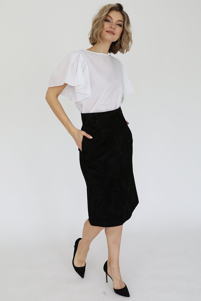 Юбка-карандаш из вельвета со шлицей по переду, притачным поясом и боковыми карманами в швах.