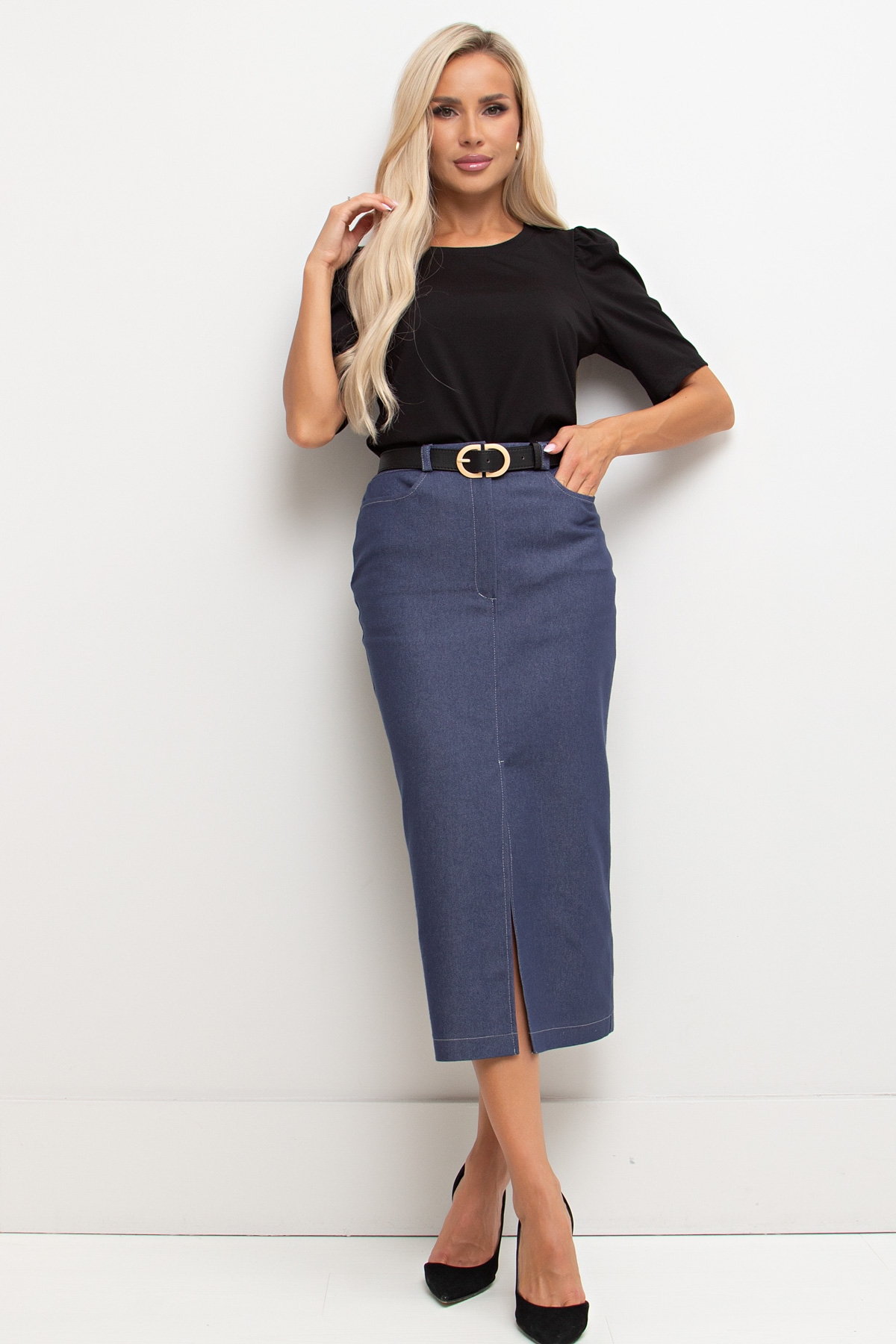 Юбка - карандаш из ткани - Джинса. Притачной пояс дополнен шлевками под ремень. По переду застежка - гульфик. По бокам выполнены функциональные карманы. Низ ровный, спереди разрез. Отличная основа для создания образа.