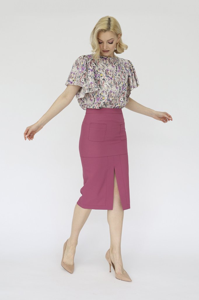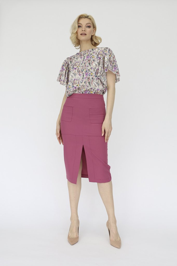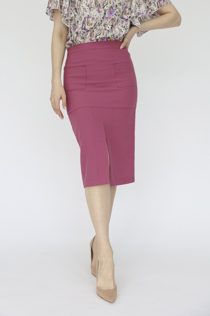 Юбка-карандаш из костюмной ткани. С накладными карманами и разрезом по переду. Застежка на потайную молнию в среднем шве спинки.