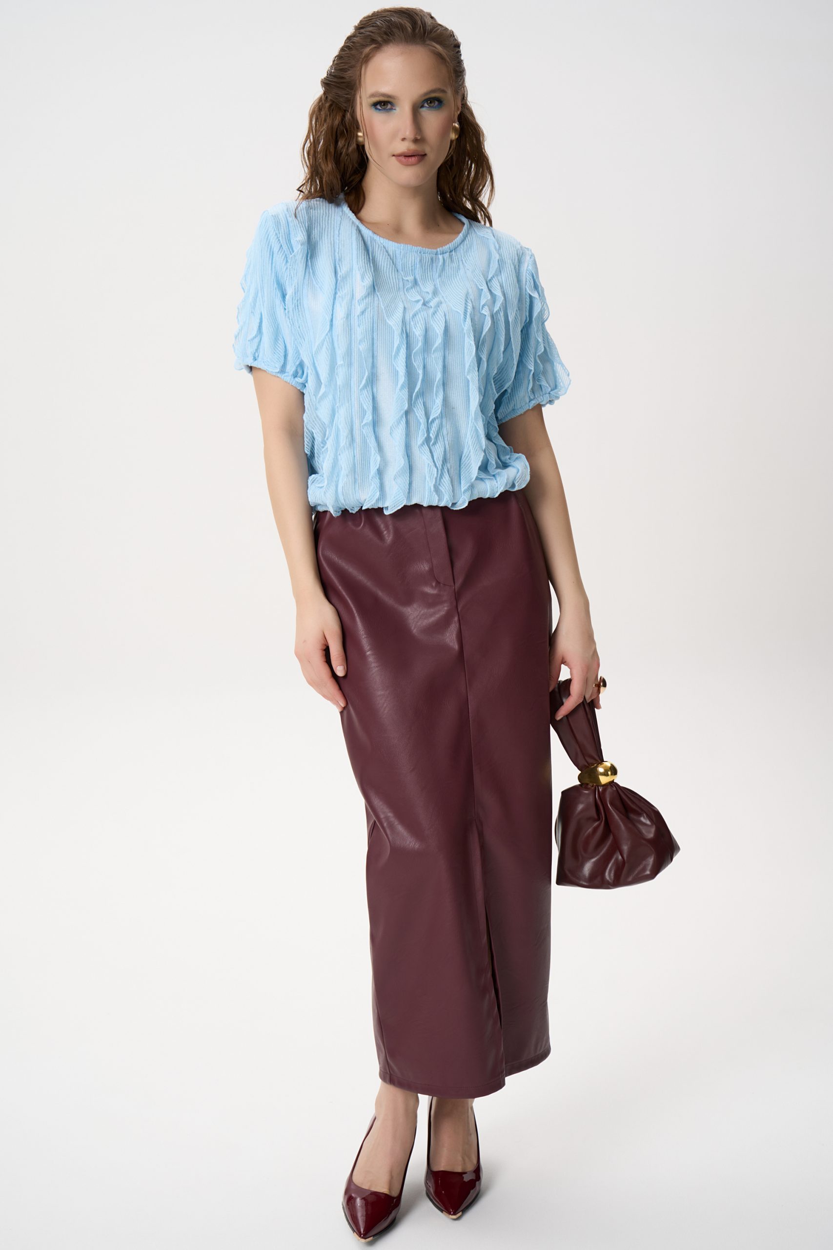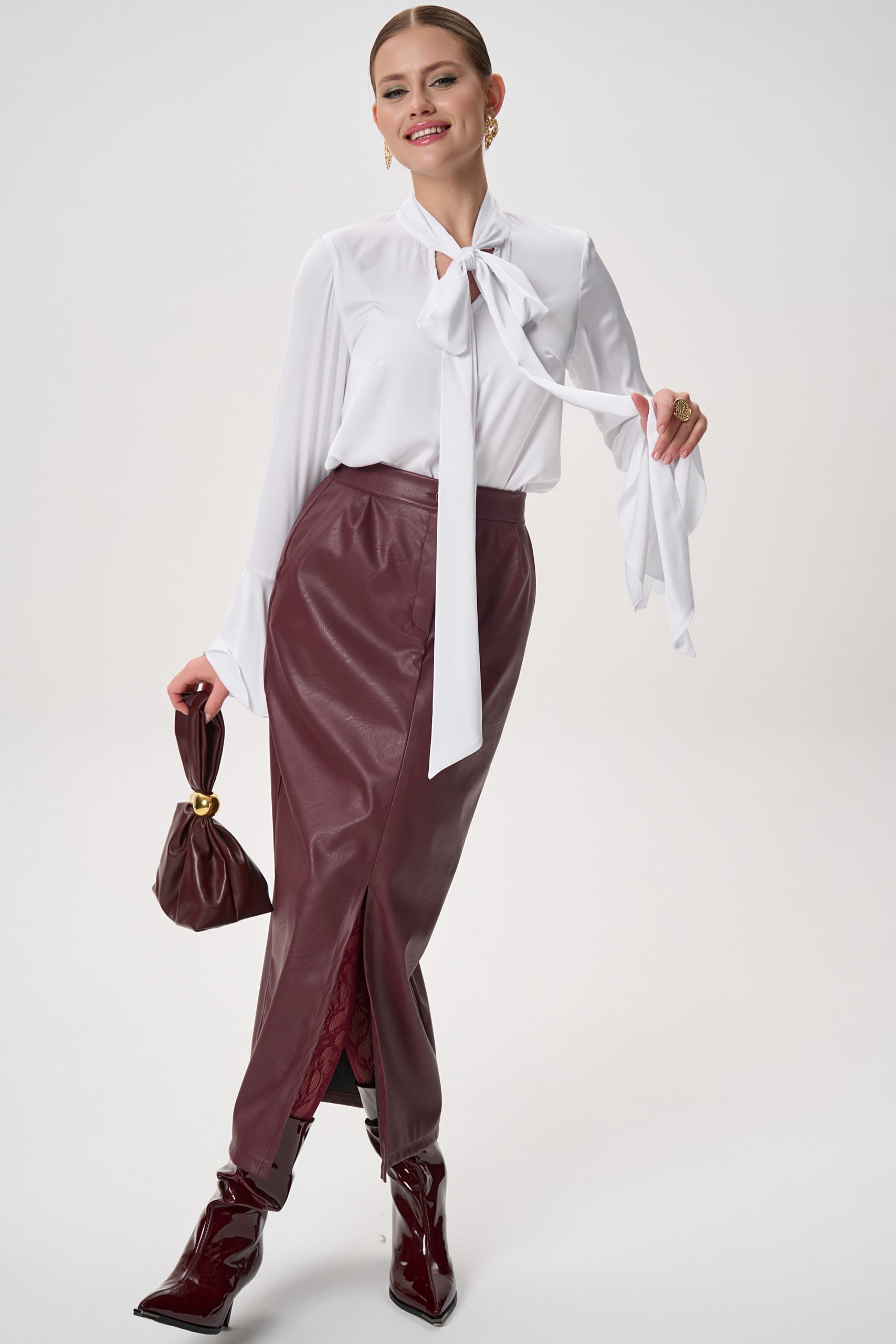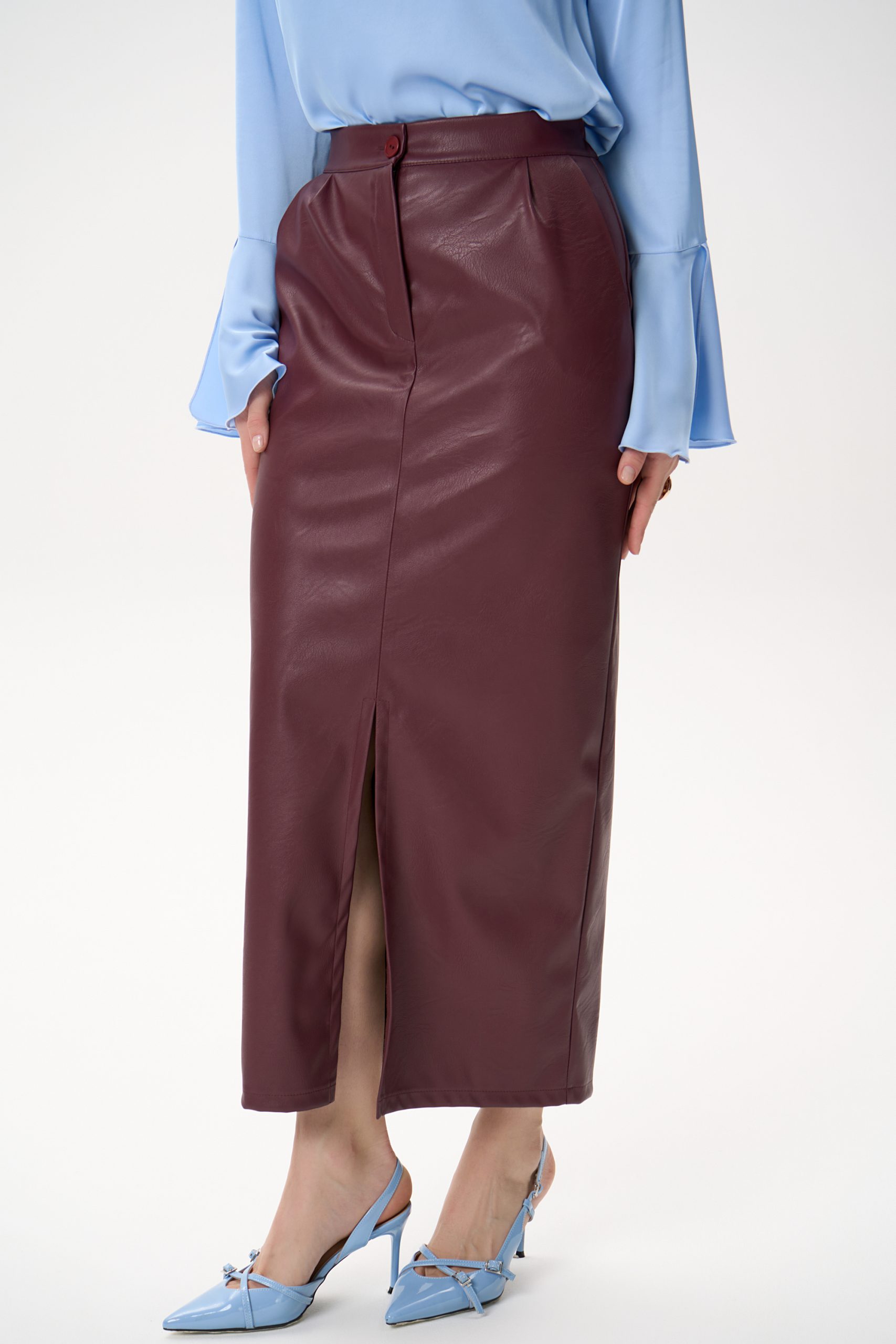 Юбка прямого силуэта, длины миди, выполнена из плотной премиальной экокожи с мягкой, пластичной фактурой.