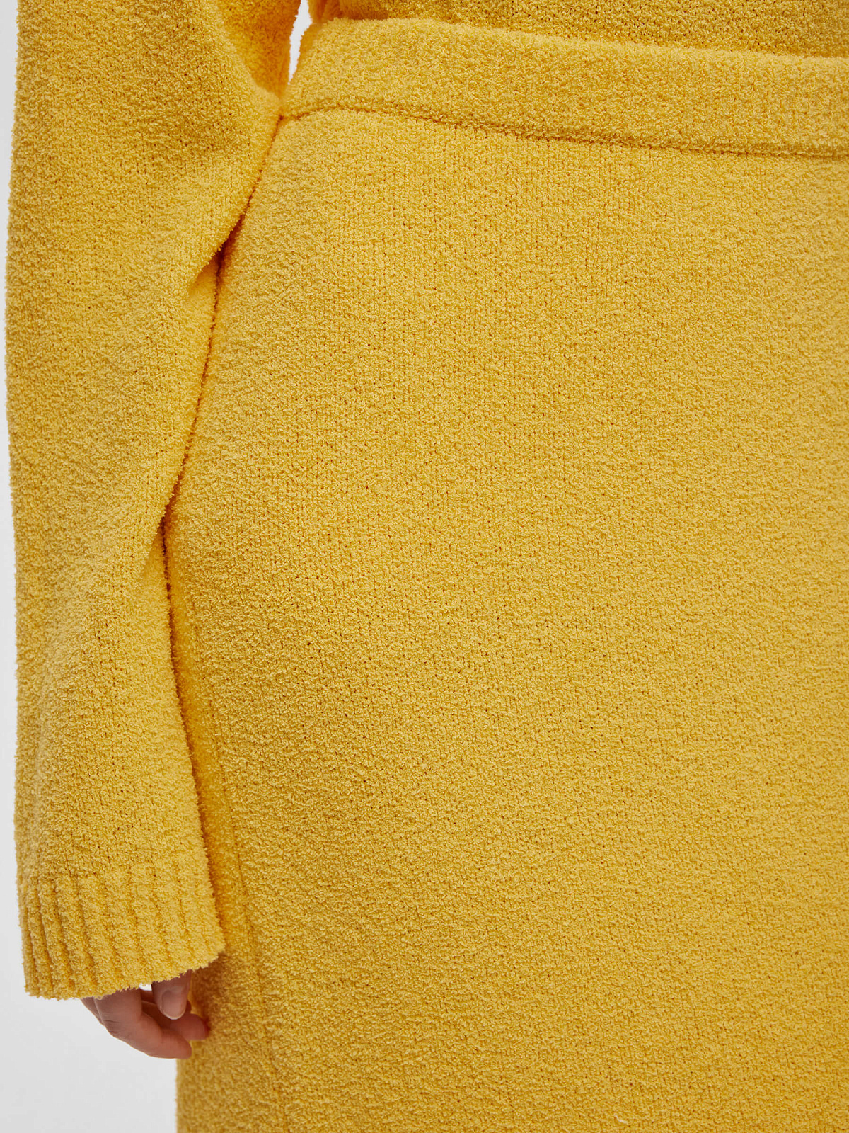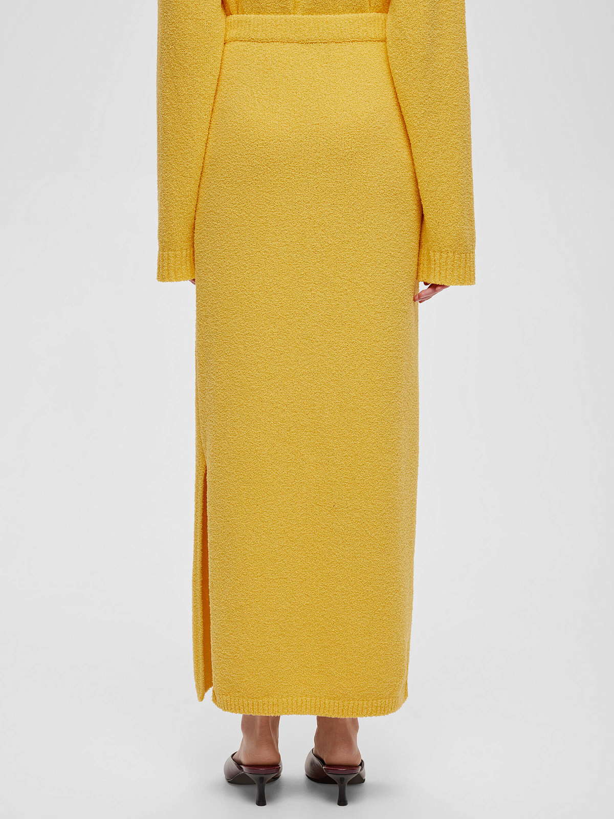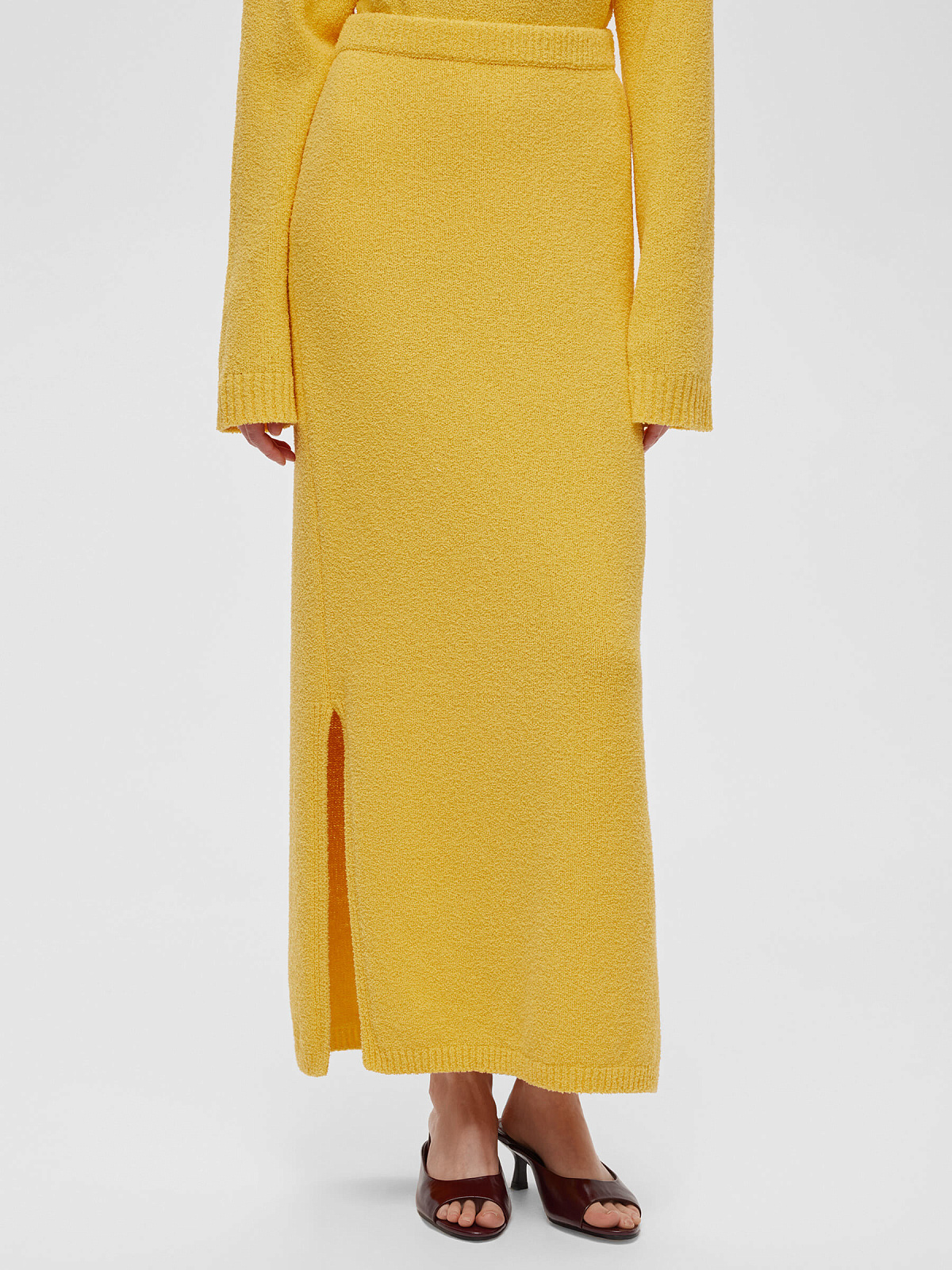 Юбка макси с эластичным широким поясом и резинкой по нижнему краю. Изготовлена из фактурной пряжи на хлопковой основе с эффектом букле.