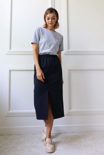 Юбка миди с разрезом по переду изделия. Притачной пояс-кушак, который можно завязывать, как спереди, так и сзади. Застежка-молния сзади. Изделие выполнено без подкладки.