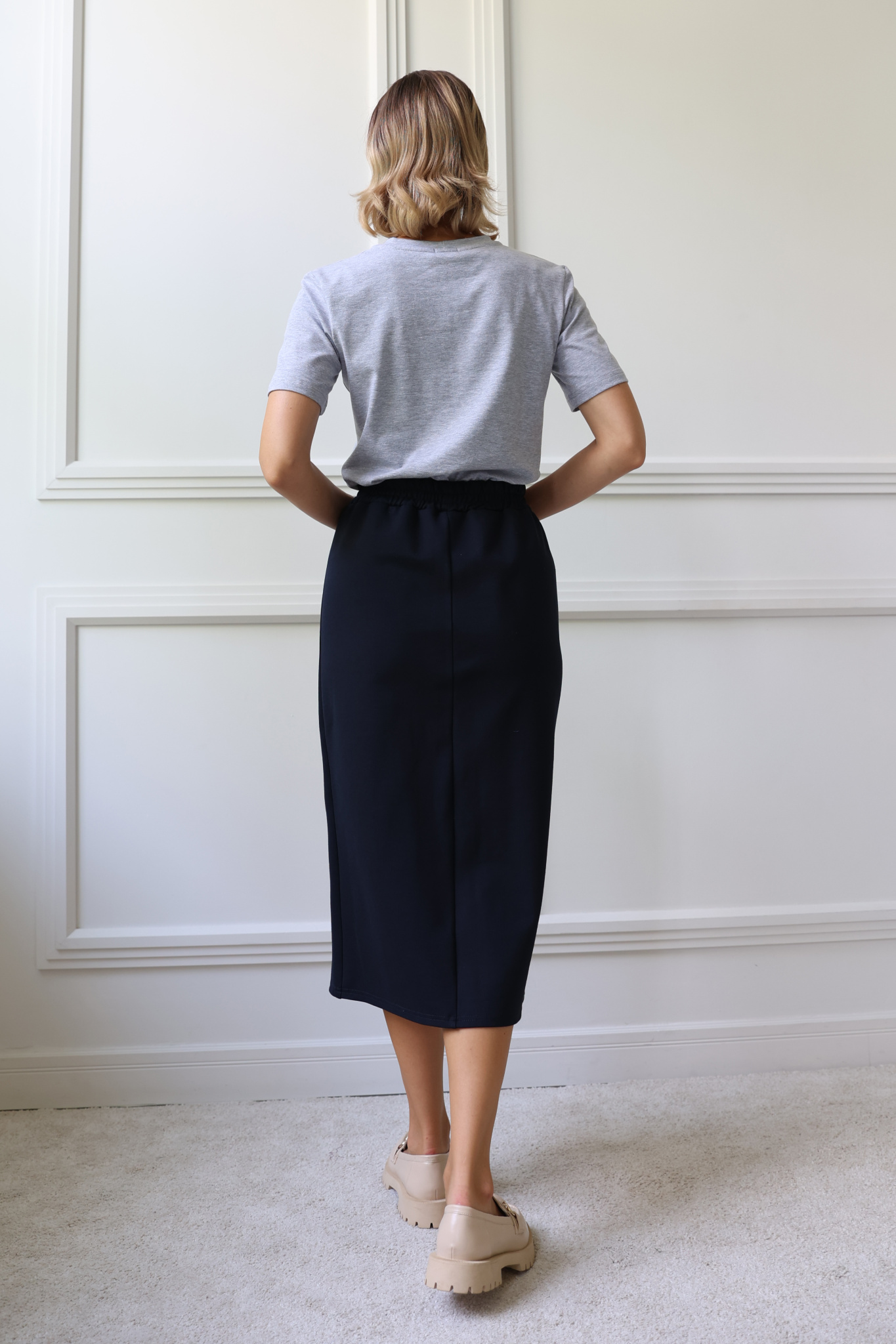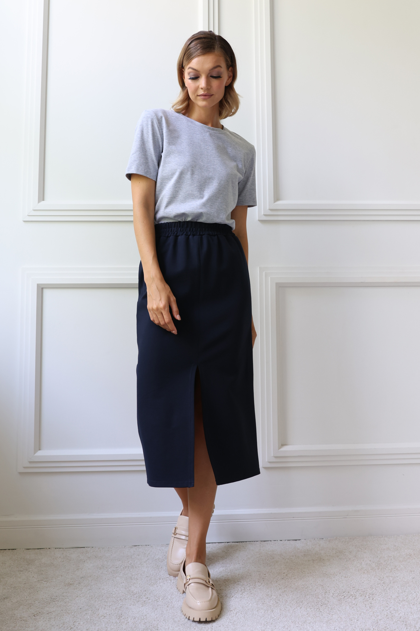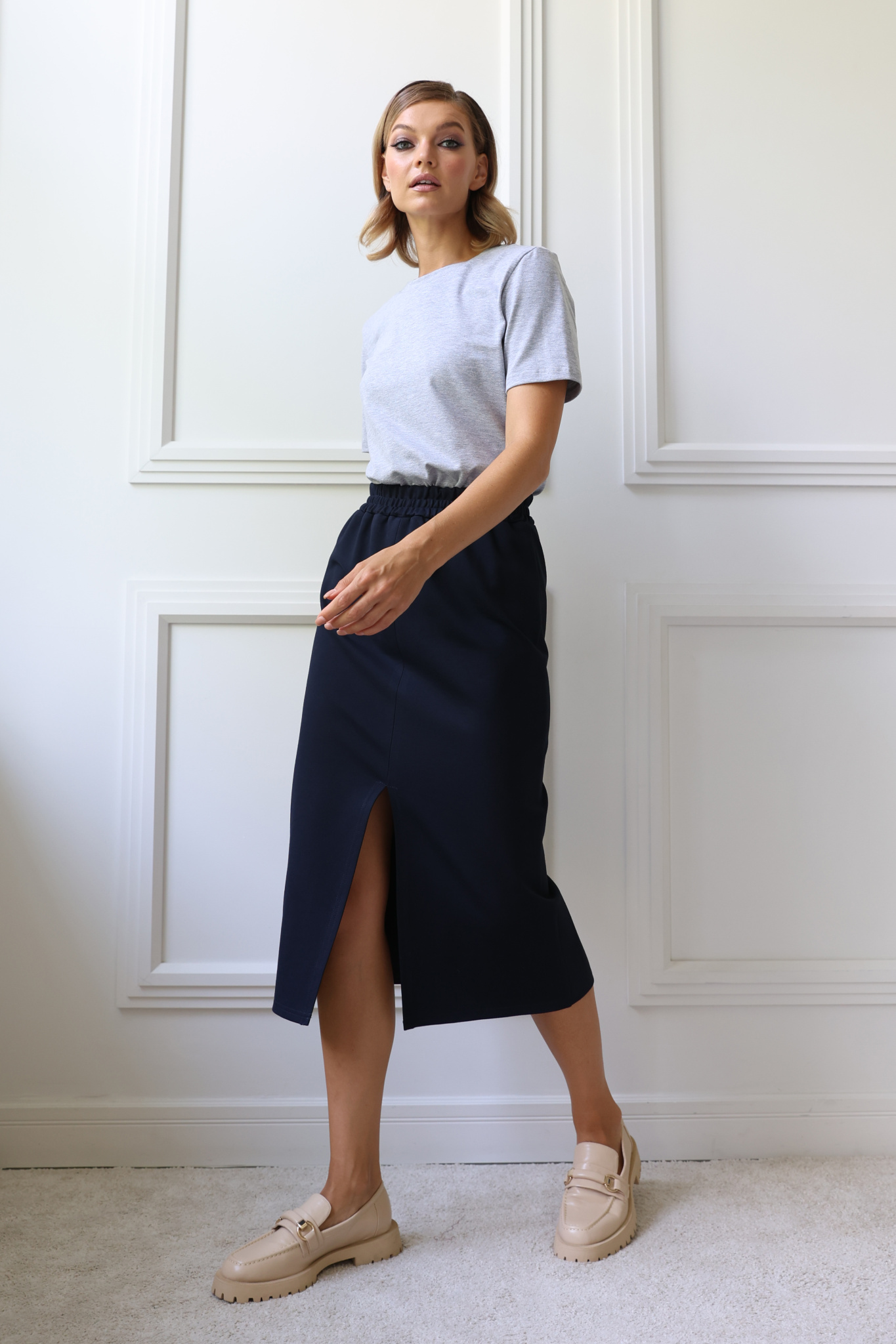 Юбка миди прямого кроя. Пояс на широкой застроченной резинке. Разрез по переду. Изделие выполнено без подкладки.