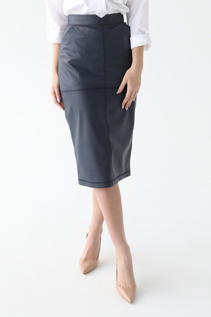 Юбка миди с декоративной отстрочкой по швам, притачным поясом, карманами в боковых швах, застежкой на молнию в среднем шве спинки и шлицей.