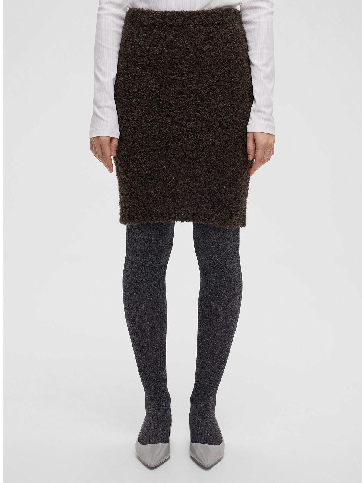 Юбка-мини с эластичным широким поясом и резинкой по нижнему краю. Изготовлена из фактурной смесовой пряжи с альпакой и шерстью в составе с эффектом букле.