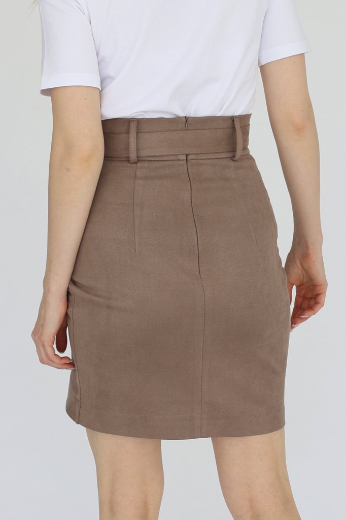 Юбка мини из замши с широким поясом. Запах по переду выполнен в виде декоративной сборки.