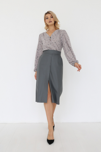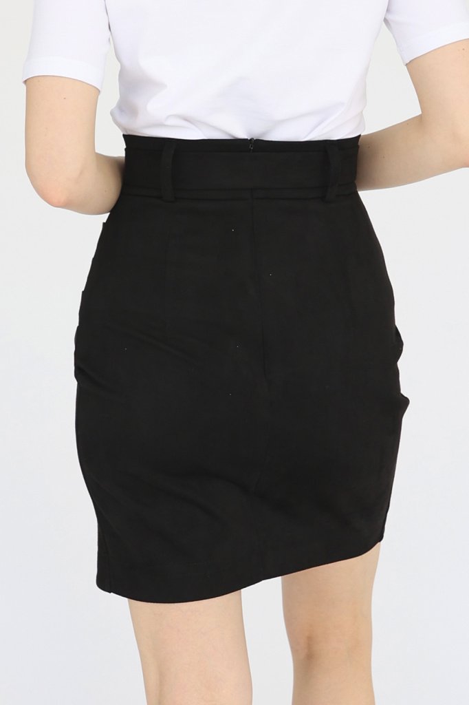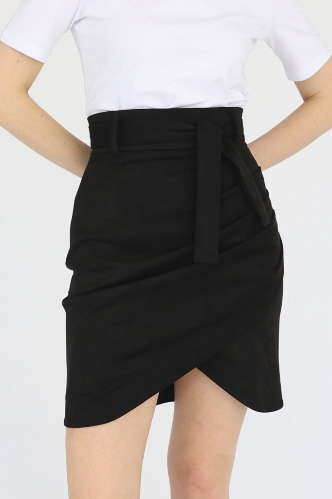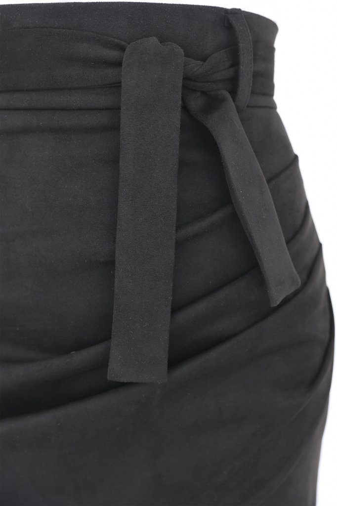 Юбка мини из замши с широким поясом. Запах по переду выполнен в виде декоративной сборки.