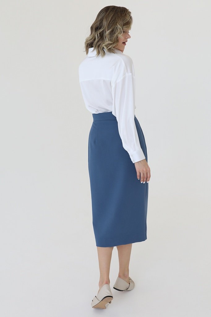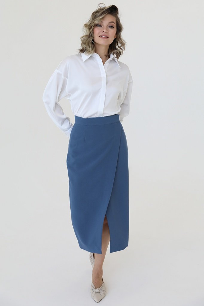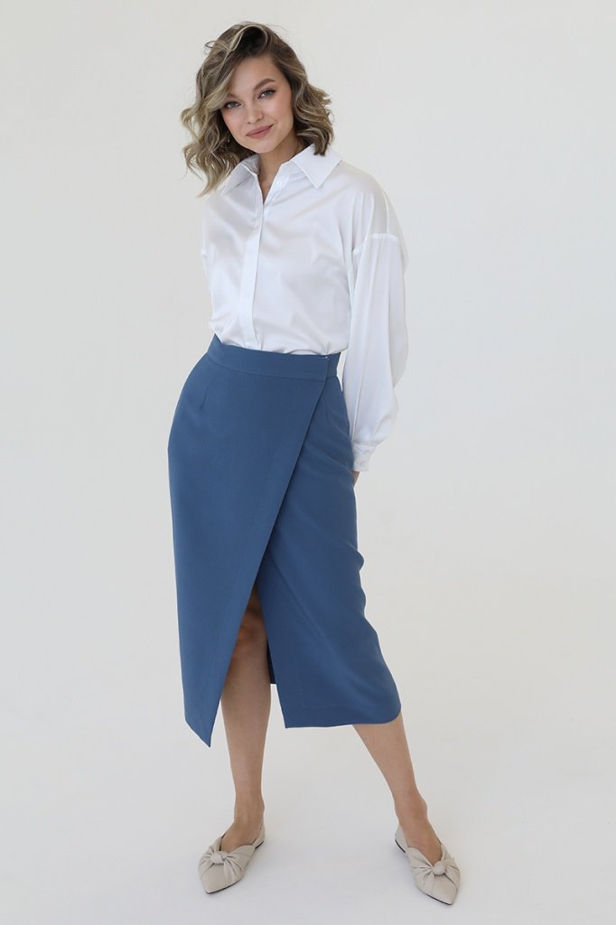 Юбка на запах с застежкой на потайную пуговицу и крючок.