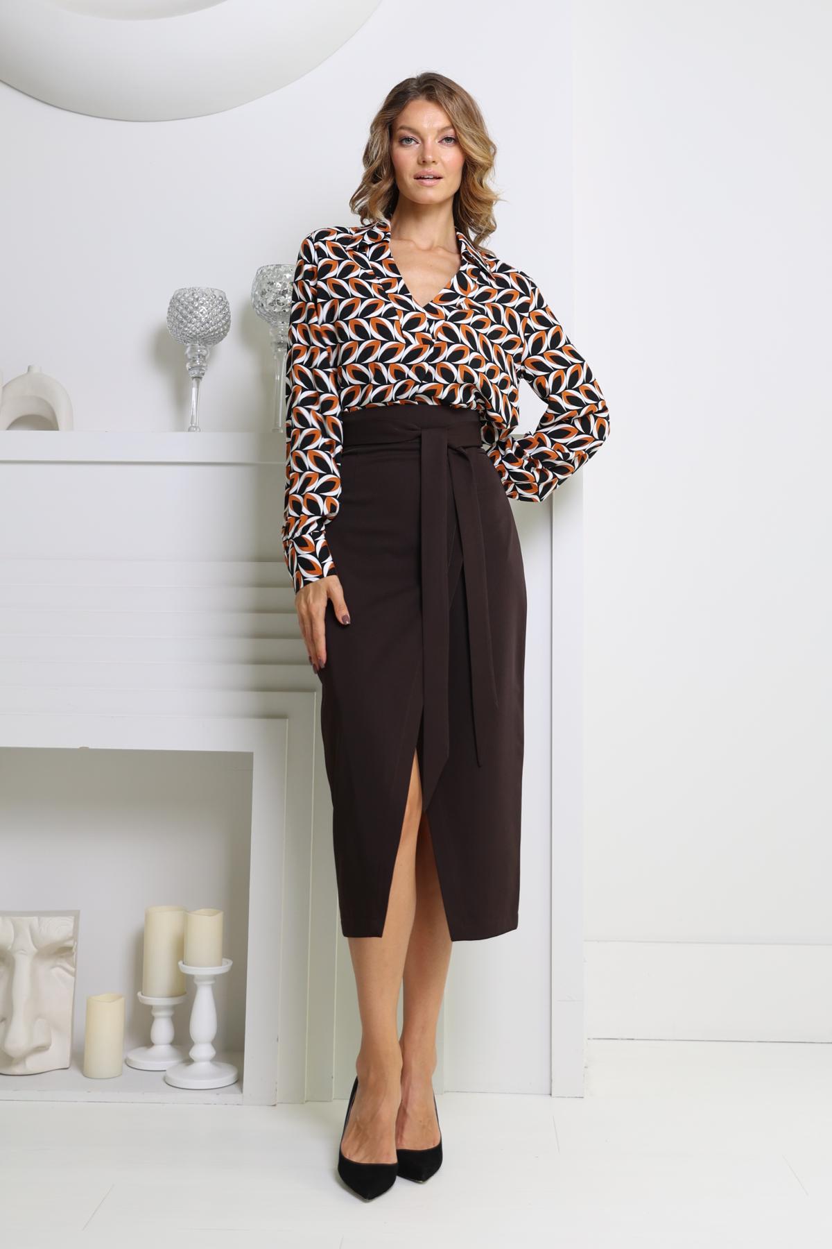 Юбка миди с запАхом и притачным поясом- кушак. Застежка на молнию в среднем шве спинки. Изделие выполнено без подкладки.