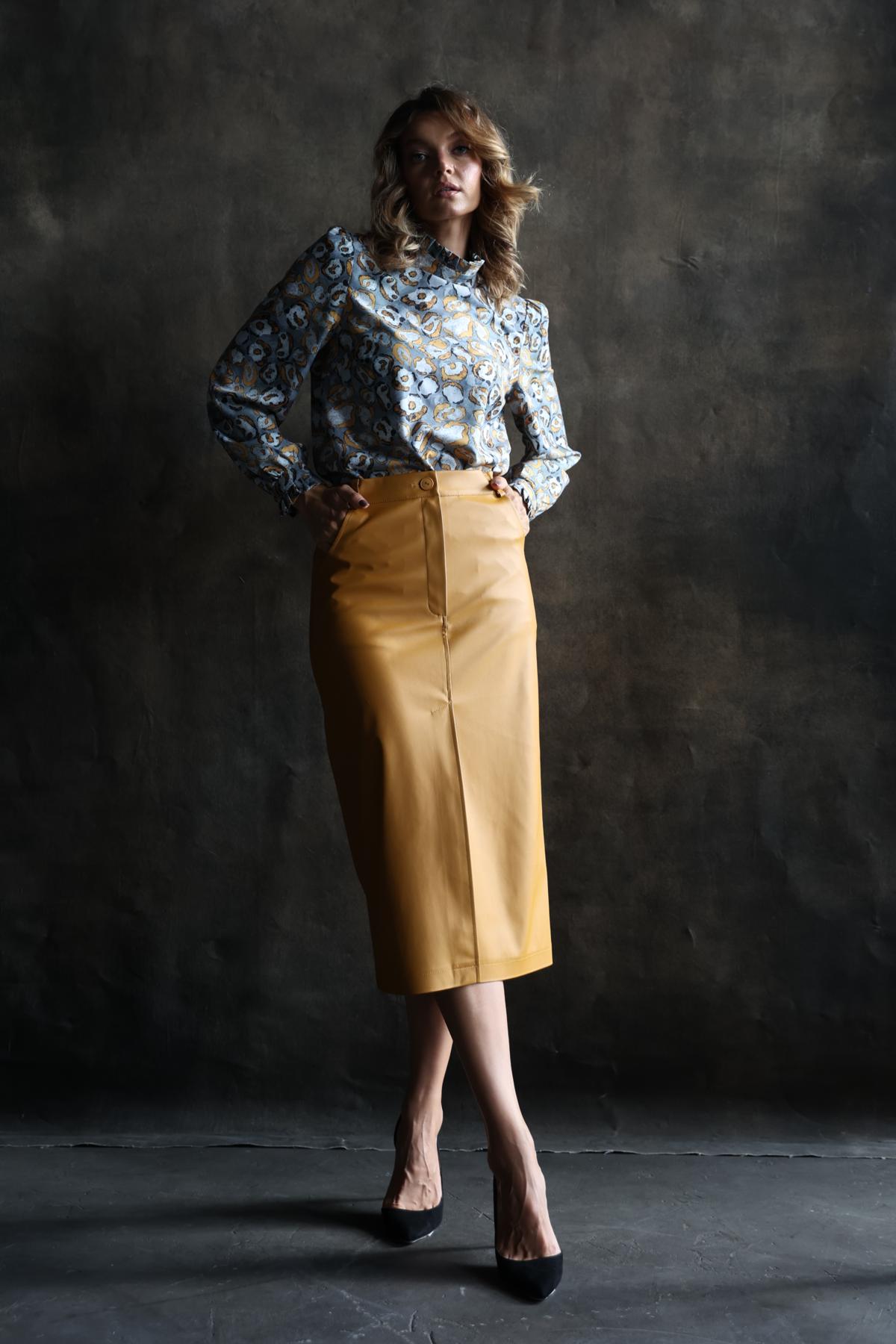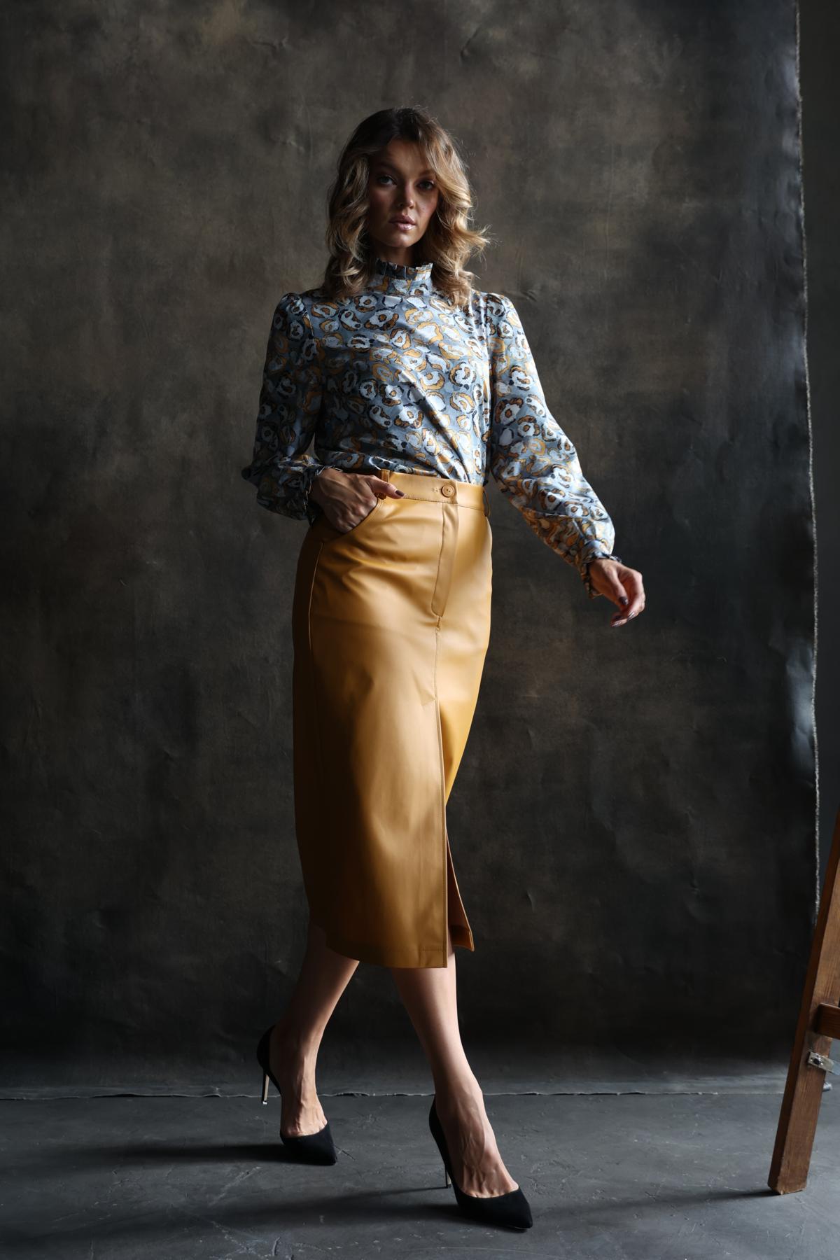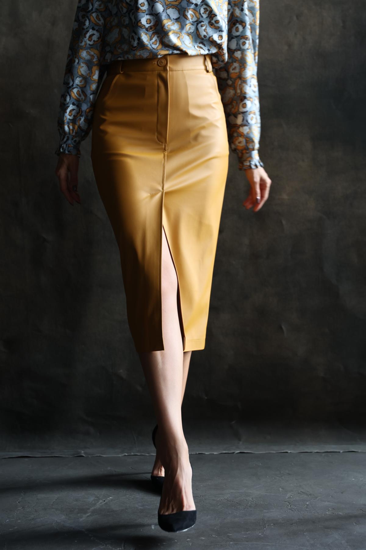 Юбка прямая из экокожи с разрезом по переду