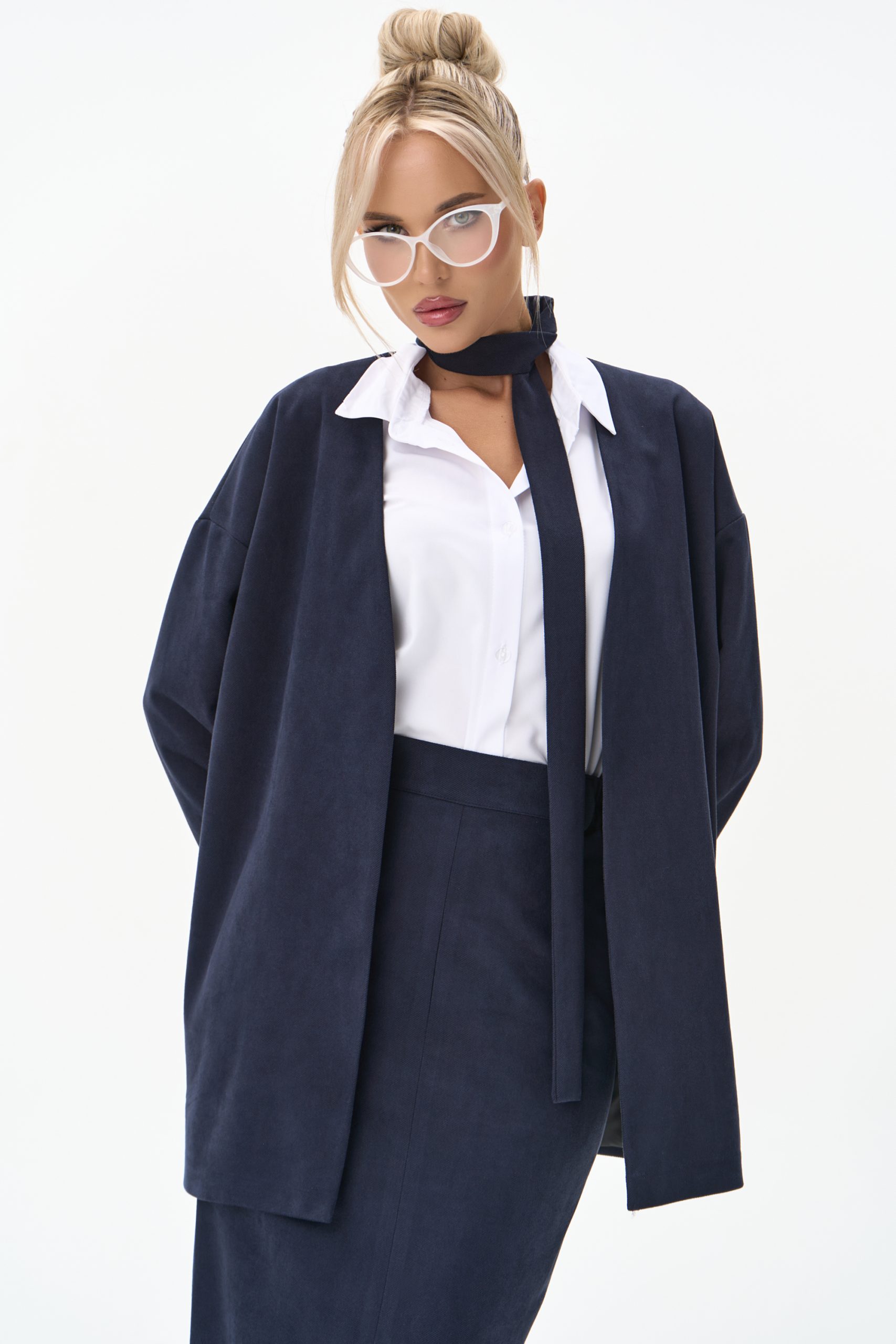 Аккуратный вырез спереди добавляет женственности, а плотный вельвет делает образ актуальным для осени. Удлинённый жакет с поясом формирует чёткий силуэт и подчёркивает талию. Он выполнен на подкладе из качественной ткани, что обеспечивает комфорт в носке и аккуратную посадку.